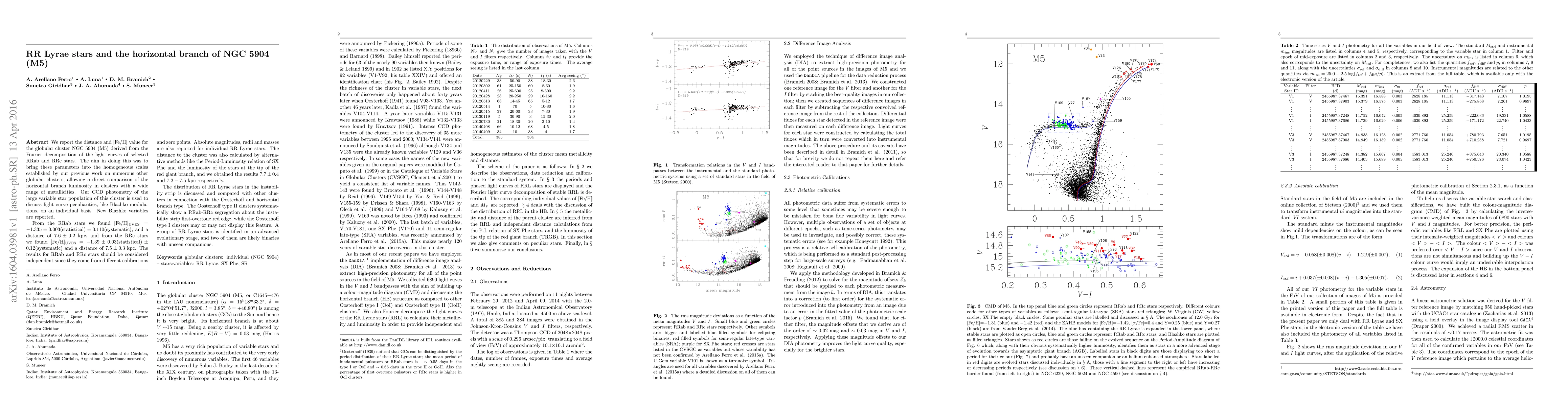 This paper reports the distance and metallicity for NGC 5904 (M5) derived from RRab and RRc stars, using Fourier decomposition and CCD photometry. The distance is found to be 7.6±0.2 kpc from RRab stars and 7.5±0.3 kpc from RRc stars, with both values showing segregation based on Oosterhoff type.