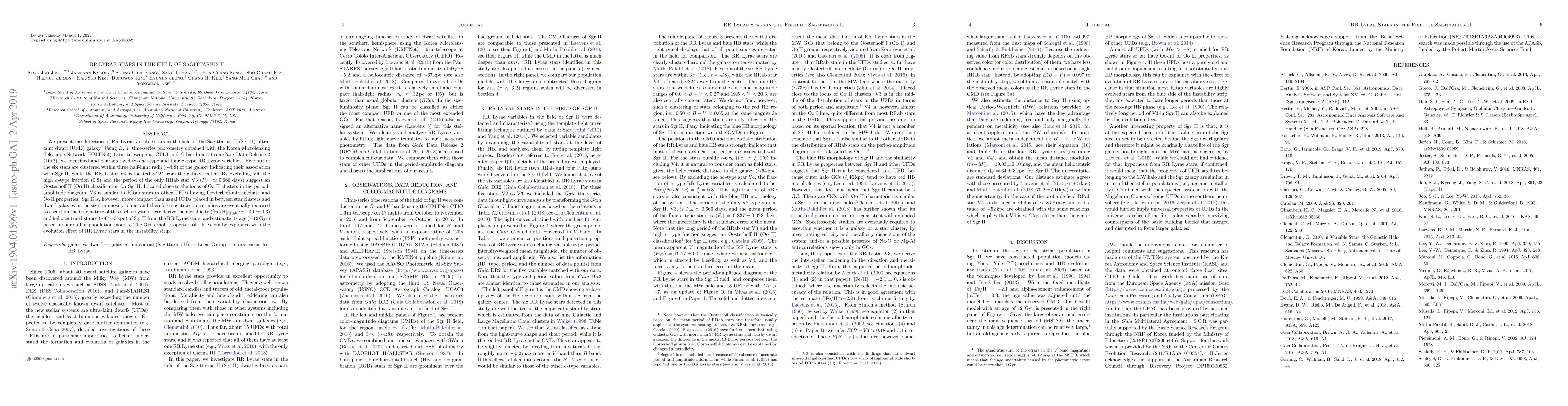 We present the detection of RR Lyrae variable stars in the field of the Sagittarius II (Sgr II) ultra-faint dwarf (UFD) galaxy. Using B, V time-series photometry obtained with the Korea Microlensing Telescope Network (KMTNet) 1.6 m telescope at CTIO and G-band data from Gaia Data Release 2 (DR2), we identified and characterized two ab-type and four c-type RR Lyrae variables. Five out of the six stars are clustered within three half-light radii (~4.8') of the galaxy indicating their association with Sgr II, while the RRab star V4 is located ~22' from the galaxy center. By excluding V4, the high c-type fraction (0.8) and the period of the only RRab star V3 (P_V3 = 0.666 days) suggest an Oosterhoff II (Oo II) classification for Sgr II. Located close to the locus of Oo II clusters in the period-amplitude diagram, V3 is similar to RRab stars in other UFDs having Oosterhoff-intermediate and Oo II properties. Sgr II is, however, more compact than usual UFDs, placed in between star clusters and dwarf galaxies in the size-luminosity plane, and therefore spectroscopic studies are eventually required to ascertain the true nature of this stellar system. We derive the metallicity ([Fe/H]_RRab = -2.1 +- 0.3) and heliocentric distance (~64 +- 3 kpc) of Sgr II from the RR Lyrae stars, and estimate its age (~12 Gyr) based on our stellar population models. The Oosterhoff properties of UFDs can be explained with the evolution effect of RR Lyrae stars in the instability strip.