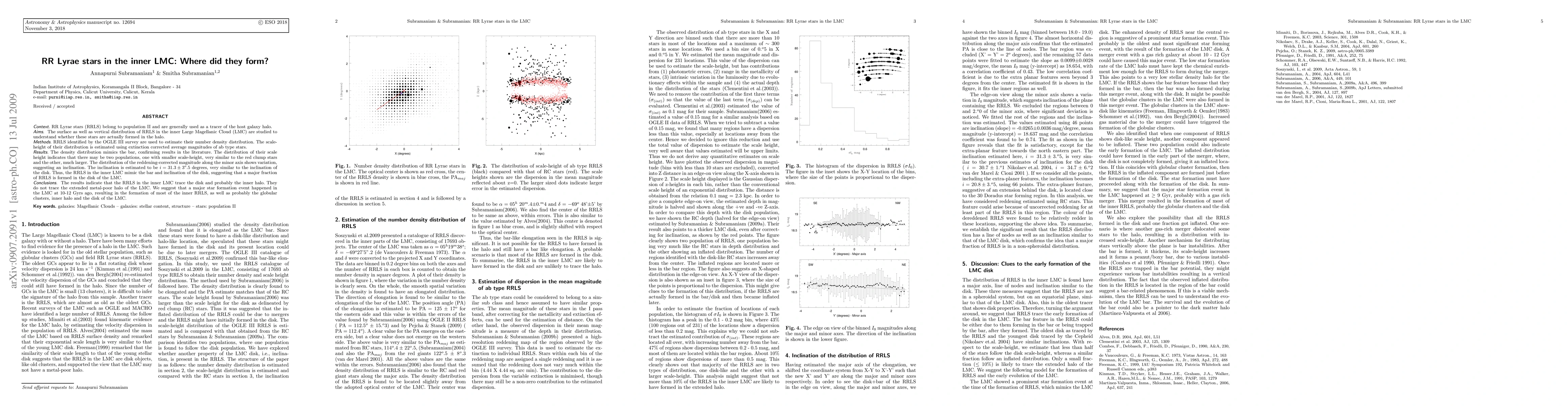 RR Lyrae stars (RRLS) belong to population II and are generally used as a tracer of the host galaxy halo. The surface as well as vertical distribution of RRLS in the inner Large Magellanic Cloud (LMC) are studied to understand whether these stars are actually formed in the halo. RRLS identified by the OGLE III survey are used to estimate their number density distribution. The scale-height of their distribution is estimated using extinction corrected average magnitudes of ab type stars. The density distribution mimics the bar, confirming results in the literature. The distribution of their scale height indicates that there may be two populations, one with smaller scale-height, very similar to the red clump stars and the other, much larger. The distribution of the reddening-corrected magnitude along the minor axis shows variation, suggesting an inclination. The inclination is estimated to be i = 31.3 (3.5) degrees, very similar to the inclination of the disk. Thus, the RRLS in the inner LMC mimic the bar and inclination of the disk, suggesting that a major fraction of RRLS is formed in the disk of the LMC. The results indicate that the RRLS in the inner LMC trace the disk and probably the inner halo. They do not trace the extended metal-poor halo of the LMC. We suggest that a major star formation event happened in the LMC at 10-12 Gyrs ago, resulting in the formation of most of the inner RRLS, as well as probably the globular clusters, inner halo and the disk of the LMC.