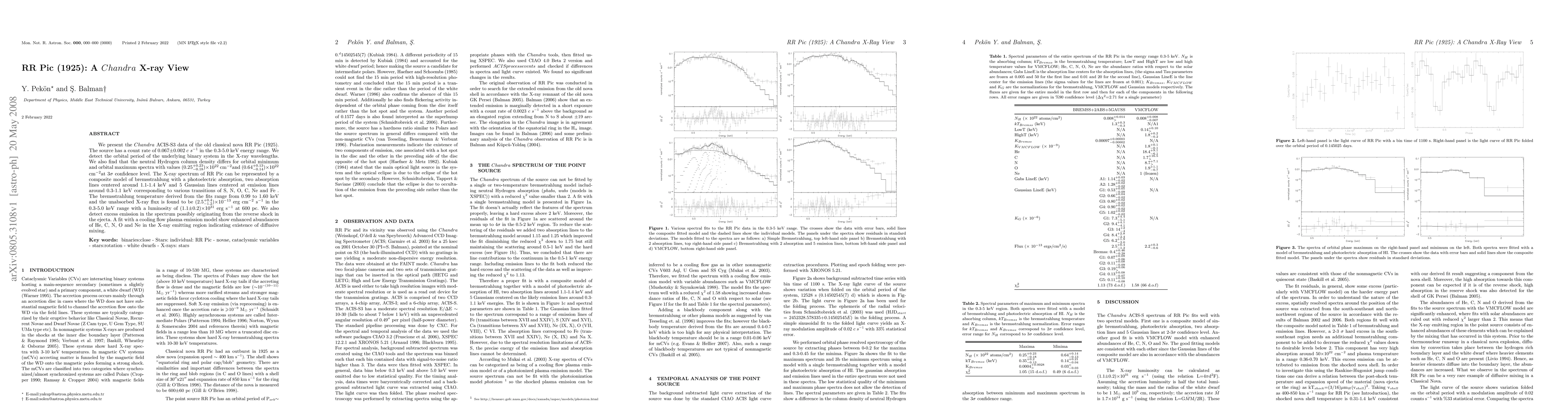 We present the Chandra ACIS-S3 data of the old classical nova RR Pic (1925). The source has a count rate of 0.067+/-0.002 c/s in the 0.3-5.0 keV energy range. We detect the orbital period of the underlying binary system in the X-ray wavelengths. We also find that the neutral Hydrogen column density differs for orbital minimum and orbital maximum spectra with values 0.25(+0.23-0.18)x10^22 cm^-2 and 0.64(+0.13-0.14)x10^22 cm^-2 at 3sigma confidence level. The X-ray spectrum of RR Pic can be represented by a composite model of bremsstrahlung with a photoelectric absorption, two absorption lines centered around 1.1-1.4 keV and 5 Gaussian lines centered at emission lines around 0.3-1.1 keV corresponding to various transitions of S, N, O, C, Ne and Fe . The bremsstrahlung temperature derived from the fits range from 0.99 to 1.60 keV and the unabsorbed X-ray flux is found to be 2.5(+0.4-1.2)x10^-13 erg cm^-2 s^-1 in the 0.3-5.0 keV range with a luminosity of (1.1\pm0.2)x10^31 erg s^-1 at 600 pc. We also detect excess emission in the spectrum possibly originating from the reverse shock in the ejecta.