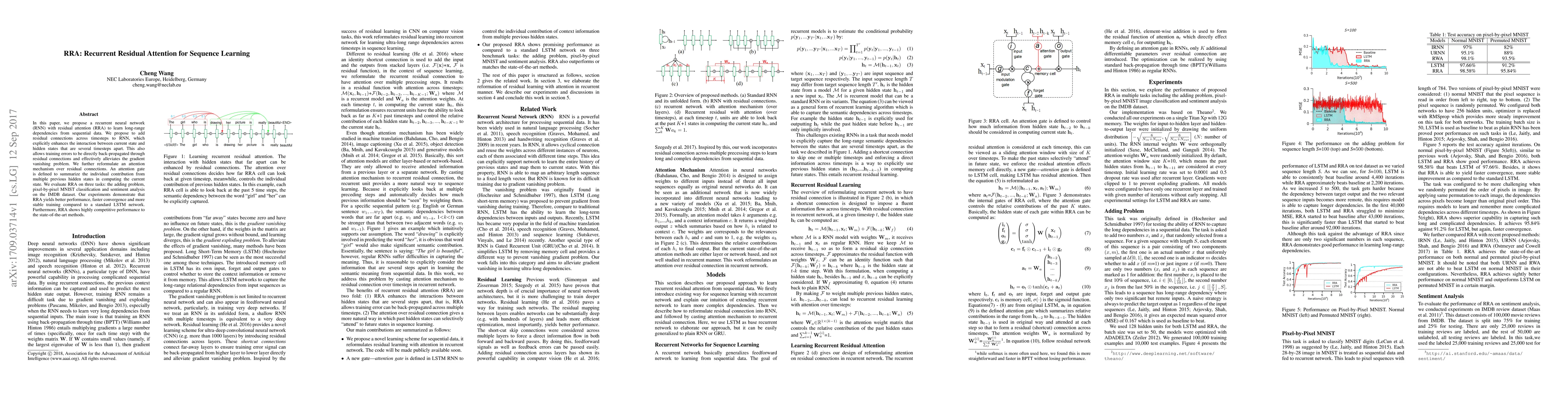 The paper introduces RRA, a recurrent neural network with residual attention, designed to enhance long-range dependency learning in sequential data. RRA incorporates residual connections and an attention mechanism to improve gradient flow and model performance, achieving superior results on tasks like MNIST classification and sentiment analysis compared to standard LSTM networks.