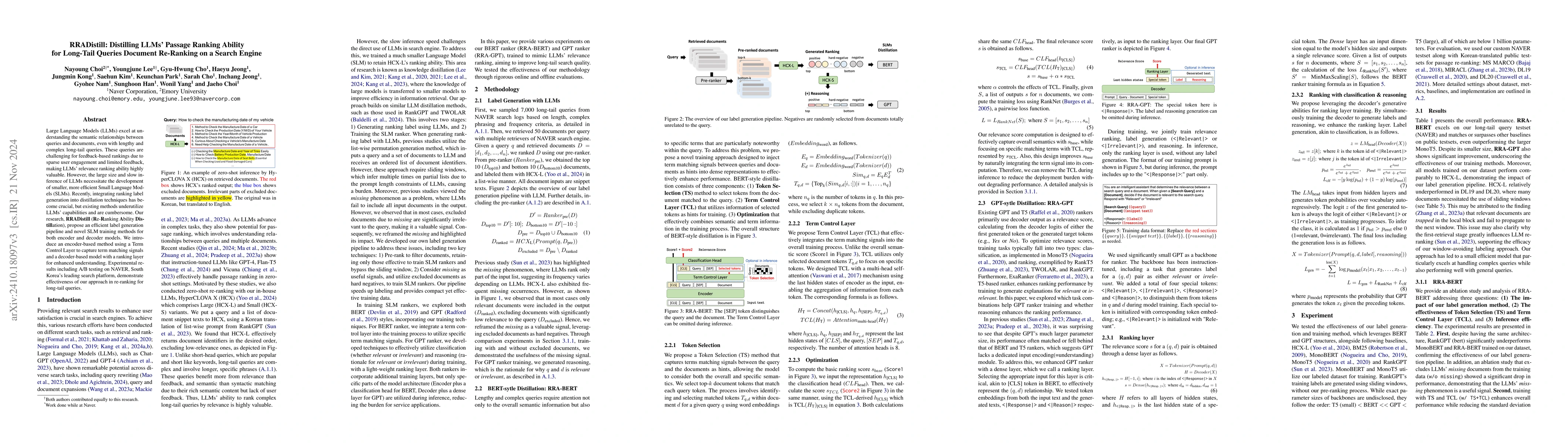 Title: RRADistill: Efficient Distillation of LLMs' Ranking for Long-Tail Query Re-Ranking Summary: This paper proposes RRADistill, a method for distilling large language models' ranking capabilities into smaller, efficient models for better handling long-tail queries in search engines. The approach uses an encoder-based Term Control Layer and a decoder-based ranking layer to capture relevant information, validated through A/B testing on a Korean search platform.