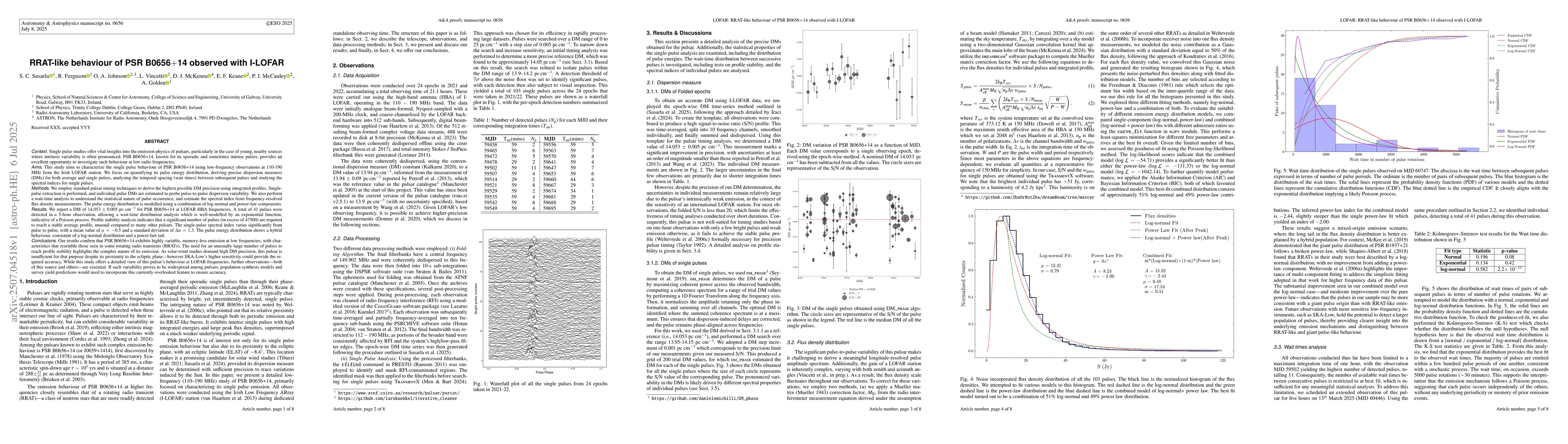 Single pulse studies offer vital insights into the emission physics of pulsars, particularly in the case of young, nearby sources where intrinsic variability is often pronounced. PSR~B0656+14, known for its sporadic and sometimes intense pulses, provides an excellent opportunity to investigate such behaviour at low radio frequencies. This study aims to characterize the single pulse behaviour of PSR~B0656+14 using low-frequency observations at 110-190 MHz from the Irish LOFAR station. Single-pulse extraction is performed, and individual pulse DMs are estimated to probe pulse-to-pulse dispersion variability. We also perform a wait-time analysis to understand the statistical nature of pulse occurrence, and estimate the spectral index from frequency-resolved flux density measurements. The pulse energy distribution is modelled using a combination of log-normal and power-law components. A total of 41 pulses were detected in a 5-hour observation, allowing a wait-time distribution analysis which is well-modelled by an exponential function, indicative of a Poisson process. Profile stability analysis indicates that a significant number of pulses are required to reach a stable average profile, unusual compared to many other pulsars. The single-pulse spectral index varies significantly from pulse to pulse, with a mean value of $\alpha = -0.5$ and a standard deviation of $\Delta\alpha=1.3$. The pulse energy distribution shows a hybrid behaviour, consistent of a log-normal distribution and a power-law tail. Our results confirm that PSR~B0656+14 exhibits highly variable, memory-less emission at low frequencies, with characteristics that resemble those seen in some rotating radio transients (RRATs). If such variability proves to be widespread among pulsars, population synthesis models and survey yield predictions would need to incorporate this currently overlooked feature to ensure accuracy.