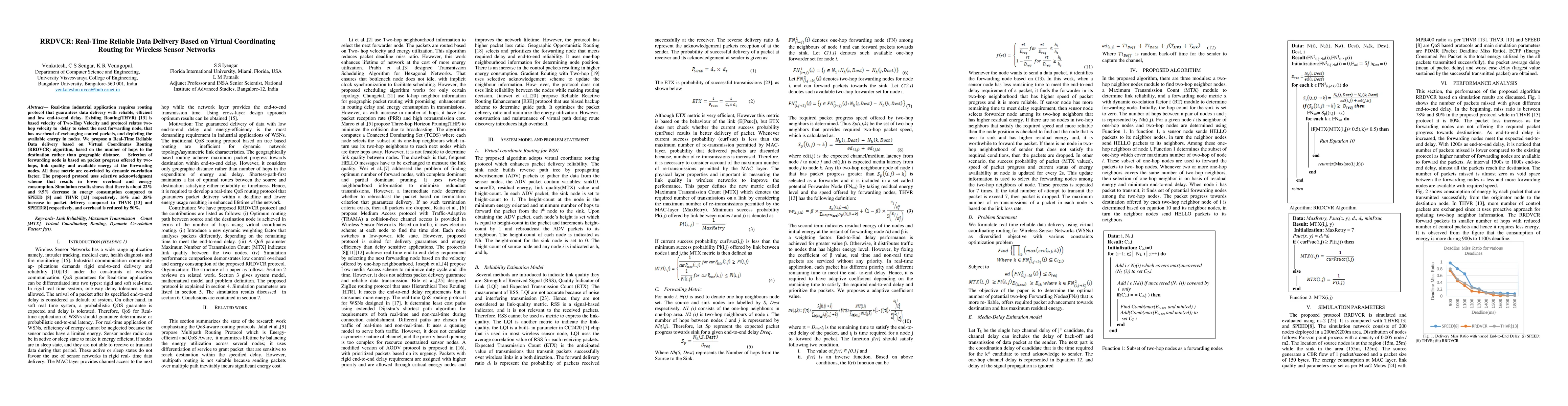 The paper proposes RRDVCR, a routing protocol for wireless sensor networks that enhances real-time data delivery by using virtual coordinates routing based on hop count, packet progress, link quality, and node energy. The protocol reduces overhead and energy consumption by 22% compared to SPEED and 9.5% compared to THVR, while increasing packet delivery by 16% and 38% respectively.