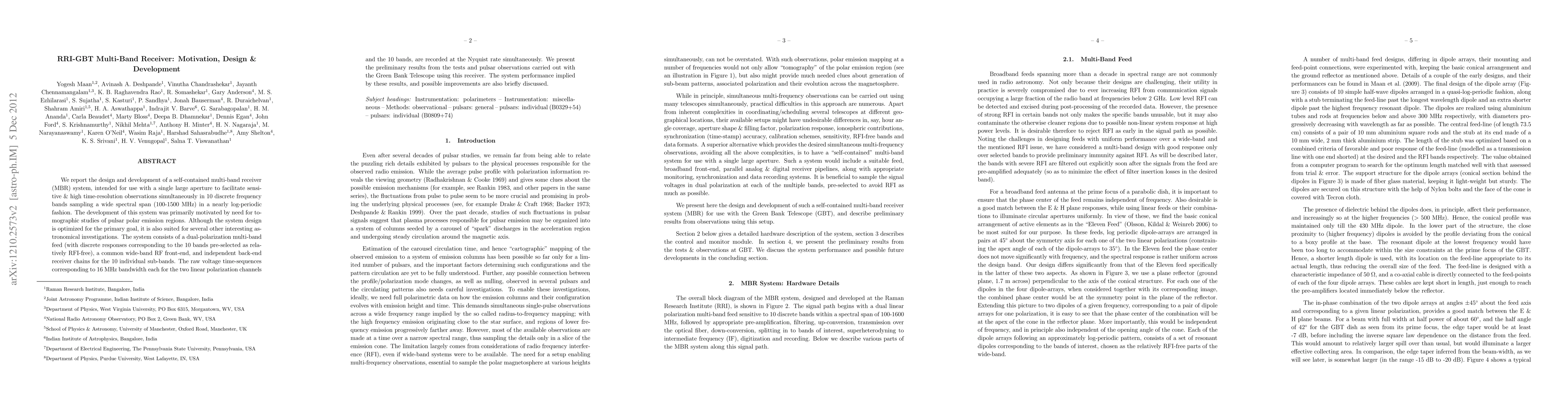 We report the design and development of a self-contained multi-band receiver (MBR) system, intended for use with a single large aperture to facilitate sensitive & high time-resolution observations simultaneously in 10 discrete frequency bands sampling a wide spectral span (100-1500 MHz) in a nearly log-periodic fashion. The development of this system was primarily motivated by need for tomographic studies of pulsar polar emission regions. Although the system design is optimized for the primary goal, it is also suited for several other interesting astronomical investigations. The system consists of a dual-polarization multi-band feed (with discrete responses corresponding to the 10 bands pre-selected as relatively RFI-free), a common wide-band RF front-end, and independent back-end receiver chains for the 10 individual sub-bands. The raw voltage time-sequences corresponding to 16 MHz bandwidth each for the two linear polarization channels and the 10 bands, are recorded at the Nyquist rate simultaneously. We present the preliminary results from the tests and pulsar observations carried out with the Green Bank Telescope using this receiver. The system performance implied by these results, and possible improvements are also briefly discussed.