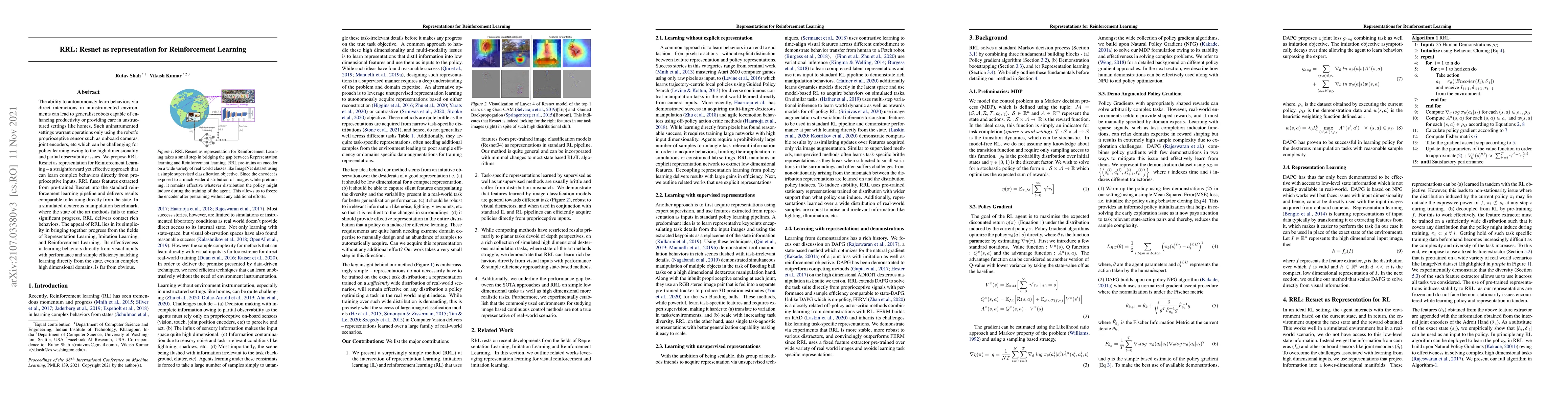 This paper proposes RRL, a method that uses pre-trained Resnet features as representations in reinforcement learning to autonomously learn complex behaviors from proprioceptive inputs. RRL demonstrates comparable performance to learning directly from the state, achieving significant progress in a simulated dexterous manipulation task.