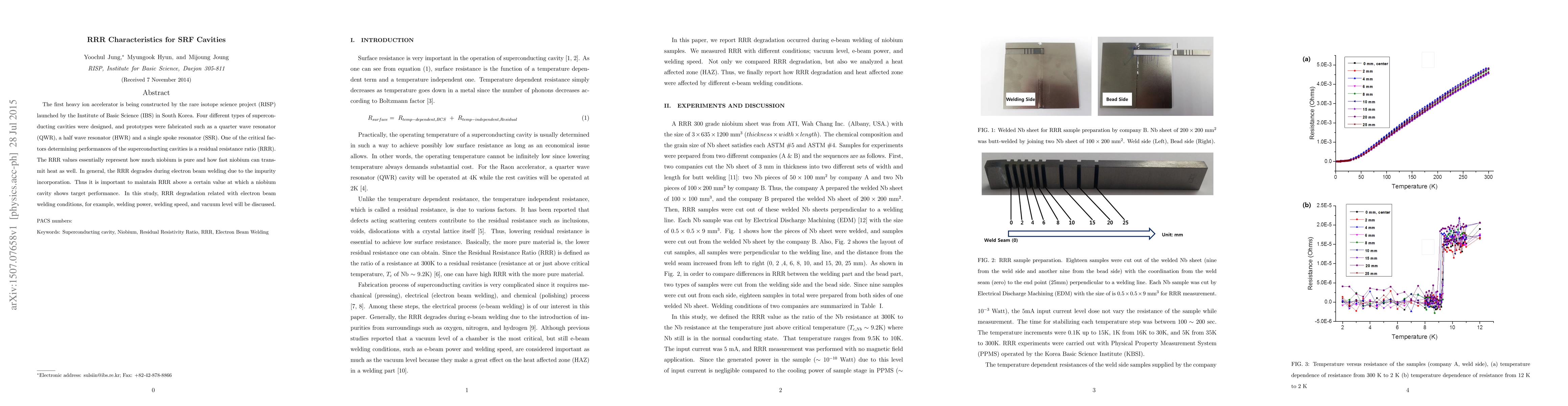 This study investigates the impact of electron beam welding conditions on the residual resistance ratio (RRR) of niobium superconducting cavities for a new heavy ion accelerator in South Korea. RRR degradation due to welding power, speed, and vacuum level is discussed, highlighting the importance of maintaining high RRR for optimal cavity performance.