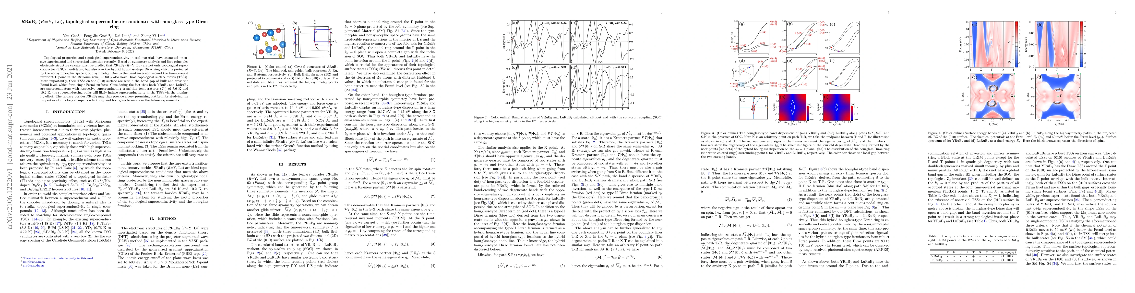 Topological properties and topological superconductivity in real materials have attracted intensive experimental and theoretical attention recently. Based on symmetry analysis and first-principles electronic structure calculations, we predict that $R$RuB$_{2}$ ($R$=Y, Lu) are not only topological superconductor (TSC) candidates, but also own the hybrid hourglass-type Dirac ring which is protected by the nonsymmorphic space group symmetry. Due to the band inversion around the time-reversal invariant $\Gamma$ point in the Brillouin zone,$R$RuB$_{2}$ also have Dirac topological surface states (TSSs). More importantly, their TSSs on the (010) surface are within the band gap of bulk and cross the Fermi level, which form single Fermi surfaces. Considering the fact that both YRuB$_{2}$ and LuRuB$_{2}$ are superconductors with respective superconducting transition temperatures ($T_c$) of 7.6 K and 10.2 K, the superconducting bulks will likely induce superconductivity in the TSSs via the proximity effect. The ternary borides $R$RuB$_{2}$ may thus provide a very promising platform for studying the properties of topological superconductivity and hourglass fermions in the future experiments.