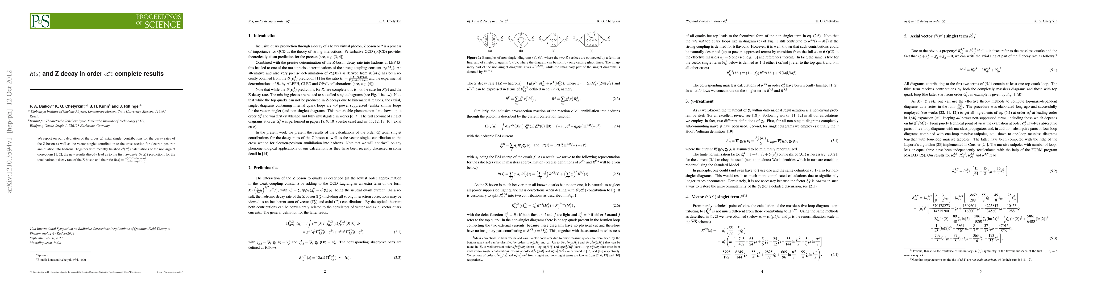 We report on our calculation of the order \alpha_s^4 axial singlet contributions for the decay rates of the Z-boson as well as the vector singlet contribution to the cross section for electron-positron annihilation into hadrons. Together with recently finished O(\alpha_s^4) calculations of the non-signlet corrections [1,2], the new results directly lead us to the first complete O(\alpha_s^4) predictions for the total hadronic decay rate of the Z-boson and the ratio R(s).
