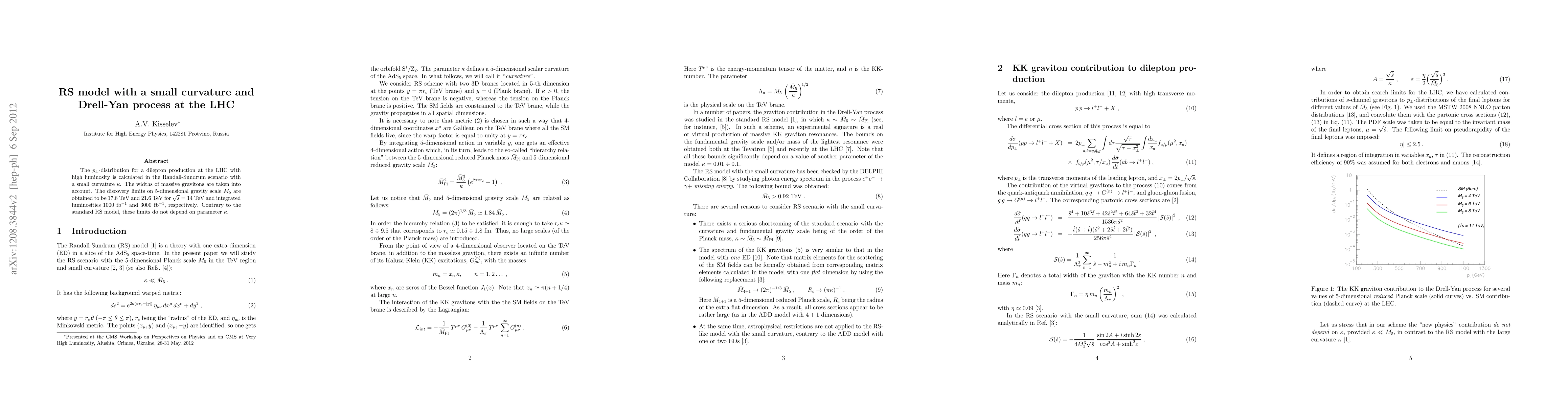This paper calculates the $p_{\perp}$-distribution for dilepton production in the Randall-Sundrum model with a small curvature, considering massive graviton widths. It finds discovery limits for the 5-dimensional gravity scale $M_5$ at the LHC, which are 17.8 TeV and 21.6 TeV for luminosities of 1000 fb$^{-1}$ and 3000 fb$^{-1}$, respectively, independent of the curvature parameter $\kappa$.