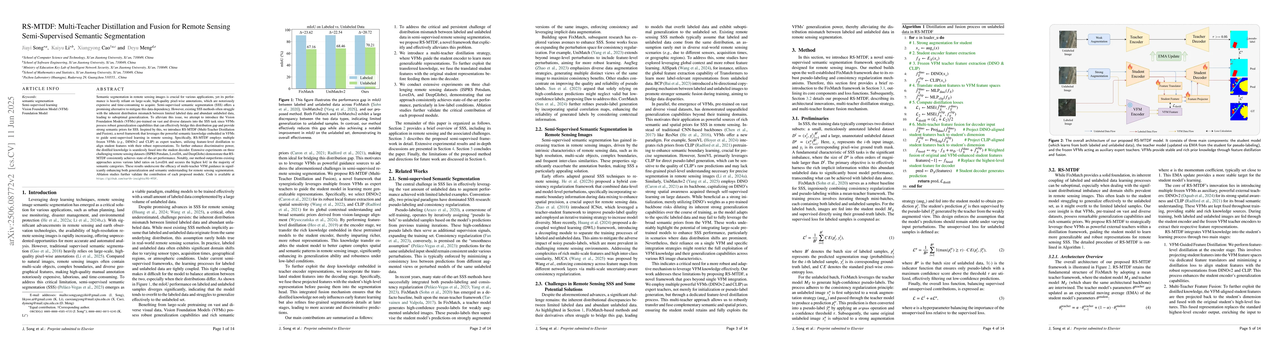 A new framework called RS-MTDF is introduced to improve semi-supervised semantic segmentation in remote sensing images by leveraging pre-trained Vision Foundation Models for guidance and fusion.