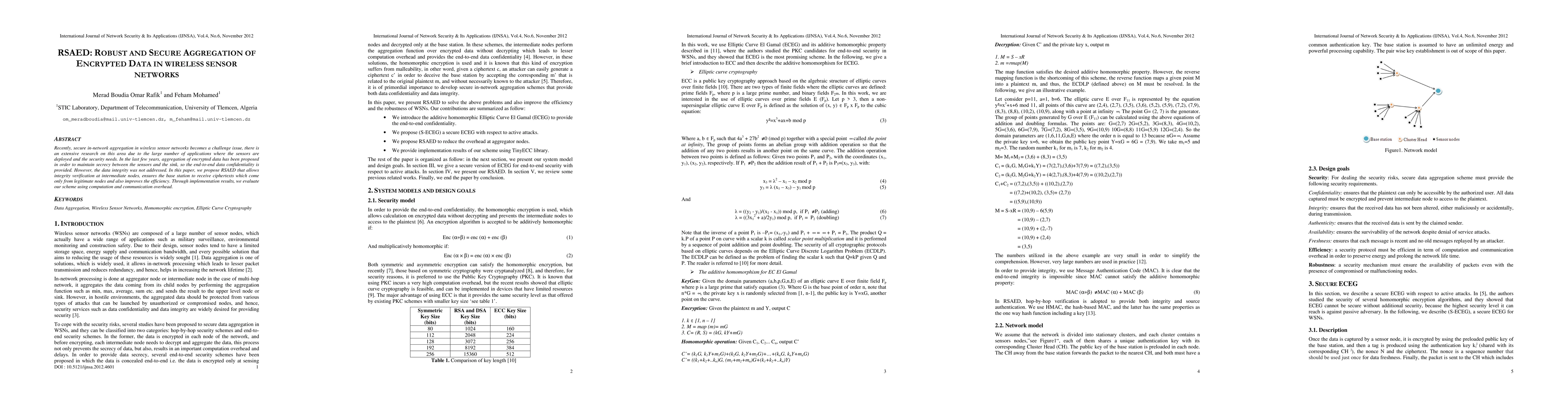 Title: RSAED: Robust and Secure Aggregation of Encrypted Data in Wireless Sensor Networks Summary: This paper proposes RSAED to address the challenge of secure in-network aggregation in wireless sensor networks, ensuring data integrity verification at intermediate nodes and enhancing efficiency while maintaining end-to-end data confidentiality. Implementation results show the scheme's computation and communication overhead.