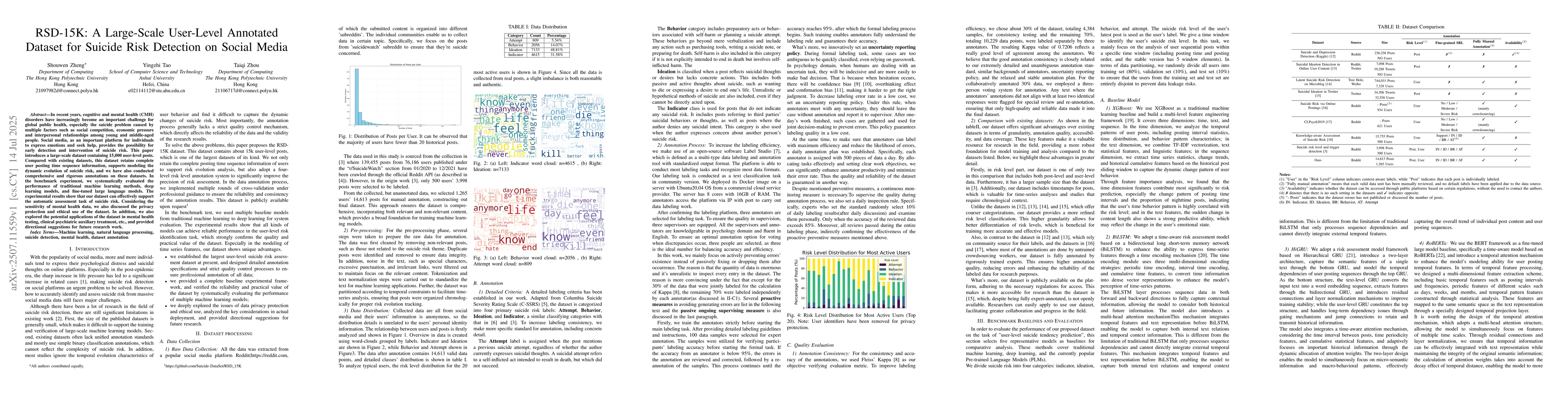 In recent years, cognitive and mental health (CMH) disorders have increasingly become an important challenge for global public health, especially the suicide problem caused by multiple factors such as social competition, economic pressure and interpersonal relationships among young and middle-aged people. Social media, as an important platform for individuals to express emotions and seek help, provides the possibility for early detection and intervention of suicide risk. This paper introduces a large-scale dataset containing 15,000 user-level posts. Compared with existing datasets, this dataset retains complete user posting time sequence information, supports modeling the dynamic evolution of suicide risk, and we have also conducted comprehensive and rigorous annotations on these datasets. In the benchmark experiment, we systematically evaluated the performance of traditional machine learning methods, deep learning models, and fine-tuned large language models. The experimental results show that our dataset can effectively support the automatic assessment task of suicide risk. Considering the sensitivity of mental health data, we also discussed the privacy protection and ethical use of the dataset. In addition, we also explored the potential applications of the dataset in mental health testing, clinical psychiatric auxiliary treatment, etc., and provided directional suggestions for future research work.