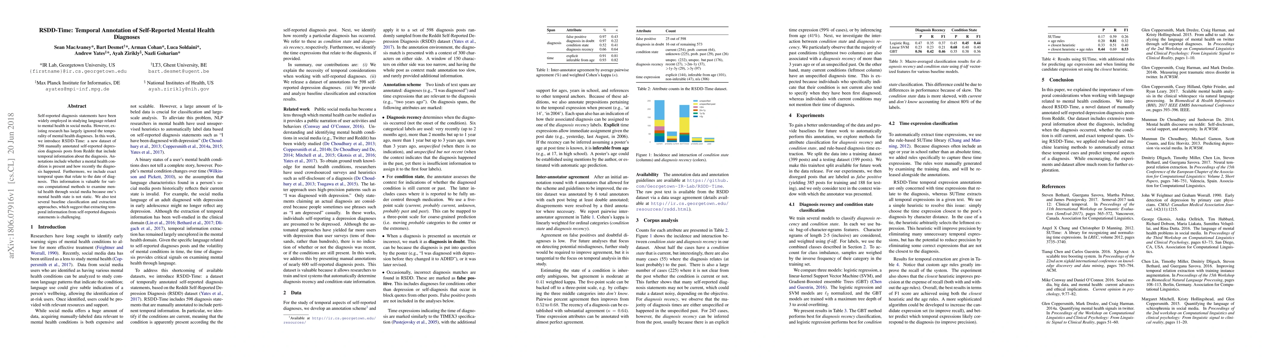This paper introduces RSDD-Time, a dataset of 598 Reddit posts with manually annotated self-reported depression diagnoses, including temporal details about when the diagnosis occurred. The study highlights the importance of temporal information in understanding mental health and tests baseline methods for extracting this data, finding it challenging.