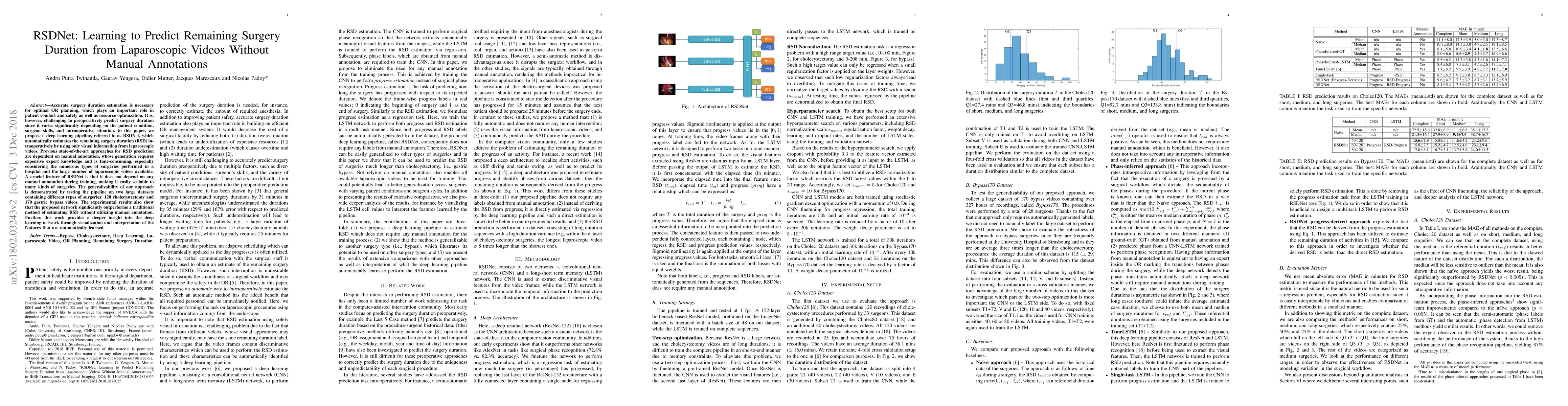 Accurate surgery duration estimation is necessary for optimal OR planning, which plays an important role in patient comfort and safety as well as resource optimization. It is, however, challenging to preoperatively predict surgery duration since it varies significantly depending on the patient condition, surgeon skills, and intraoperative situation. In this paper, we propose a deep learning pipeline, referred to as RSDNet, which automatically estimates the remaining surgery duration (RSD) intraoperatively by using only visual information from laparoscopic videos. Previous state-of-the-art approaches for RSD prediction are dependent on manual annotation, whose generation requires expensive expert knowledge and is time-consuming, especially considering the numerous types of surgeries performed in a hospital and the large number of laparoscopic videos available. A crucial feature of RSDNet is that it does not depend on any manual annotation during training, making it easily scalable to many kinds of surgeries. The generalizability of our approach is demonstrated by testing the pipeline on two large datasets containing different types of surgeries: 120 cholecystectomy and 170 gastric bypass videos. The experimental results also show that the proposed network significantly outperforms a traditional method of estimating RSD without utilizing manual annotation. Further, this work provides a deeper insight into the deep learning network through visualization and interpretation of the features that are automatically learned.