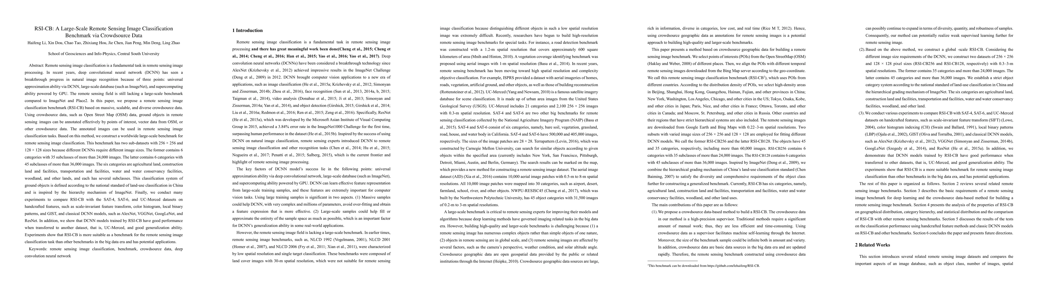 This paper proposes RSI-CB, a large-scale remote sensing image classification benchmark constructed from crowdsource data, aiming to address the lack of such benchmarks in remote sensing. It includes two sub-datasets with over 60,000 images categorized into 6 main categories and various subclasses, and compares its performance with other datasets using both handcrafted features and DCNN models.