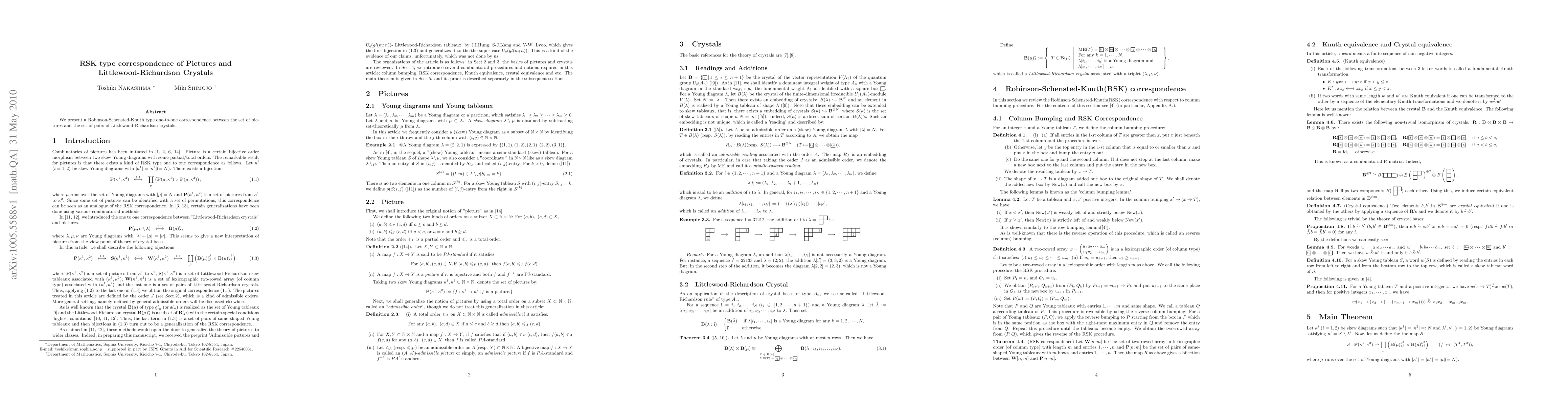 This paper establishes a Robinson-Schensted-Knuth (RSK) correspondence that maps pictures to pairs of Littlewood-Richardson crystals, offering a novel insight into the combinatorial structure linking these mathematical objects. The correspondence provides a unified framework for understanding their relationships.