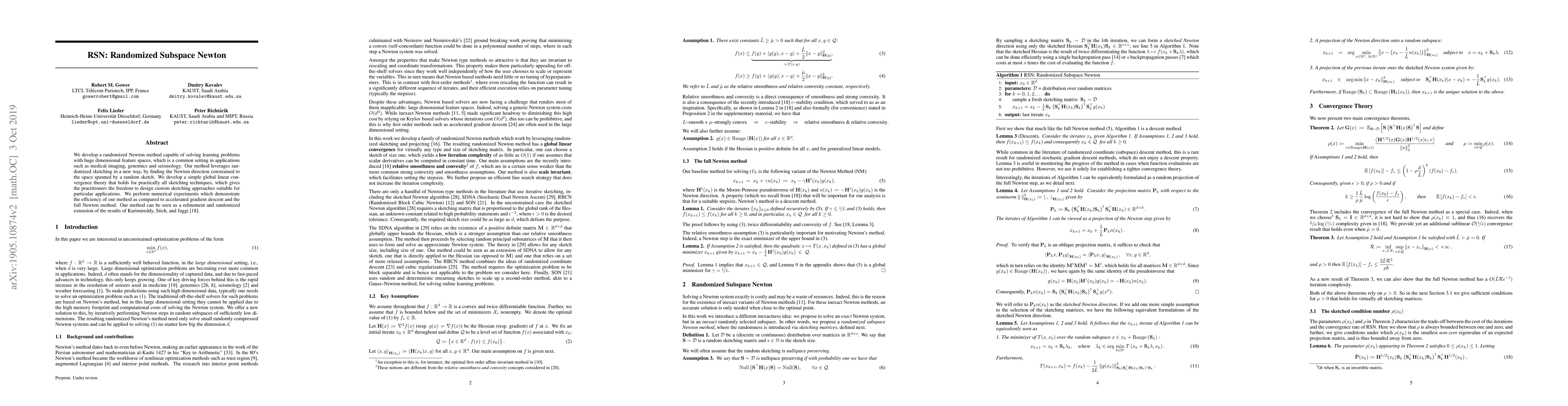 The paper introduces a randomized subspace Newton method for solving high-dimensional learning problems, leveraging randomized sketching to find the Newton direction within a constrained subspace. The method is shown to be efficient and offers global linear convergence, outperforming accelerated gradient descent and the full Newton method in numerical experiments.