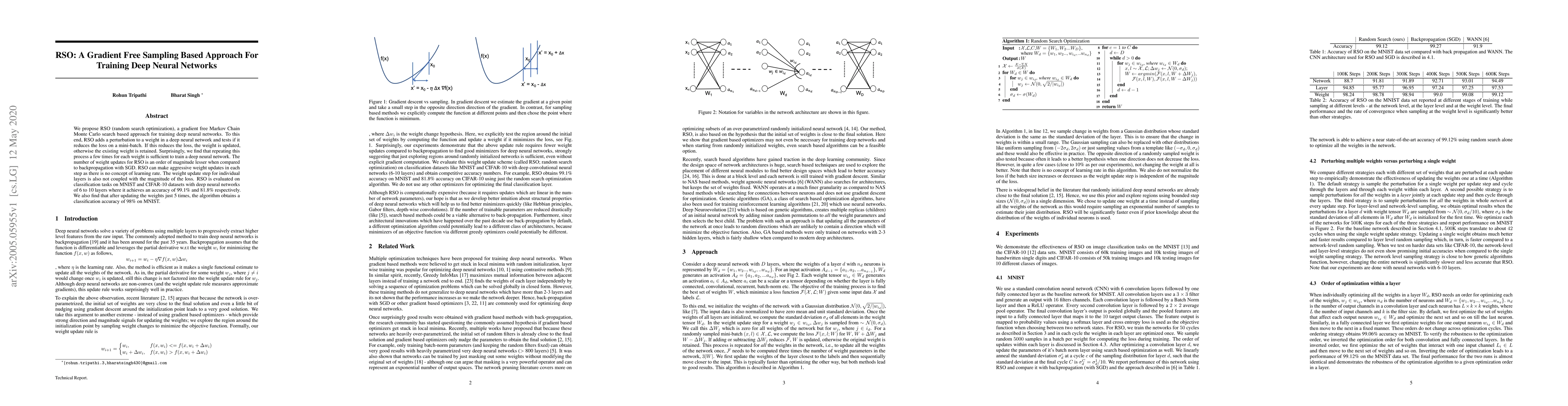 A new method called RSO (random search optimization) uses a gradient-free approach to train deep neural networks, requiring significantly fewer weight updates than traditional backpropagation methods, with impressive accuracy results on MNIST and CIFAR-10 datasets.