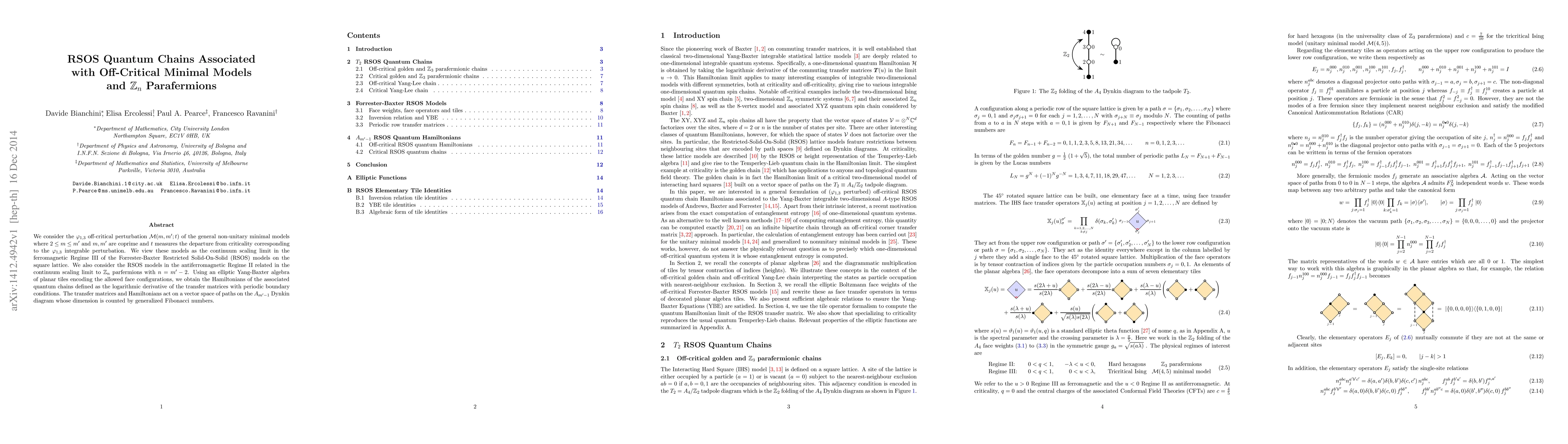 This paper studies the continuum scaling limits of off-critical minimal models and RSOS models, focusing on the $\varphi_{1,3}$ perturbation and $\mathbb{Z}_n$ parafermions. The authors derive the Hamiltonians for associated quantum chains using elliptic Yang-Baxter algebra, with the transfer matrices acting on a vector space defined by the $A_{m'-1}$ Dynkin diagram.