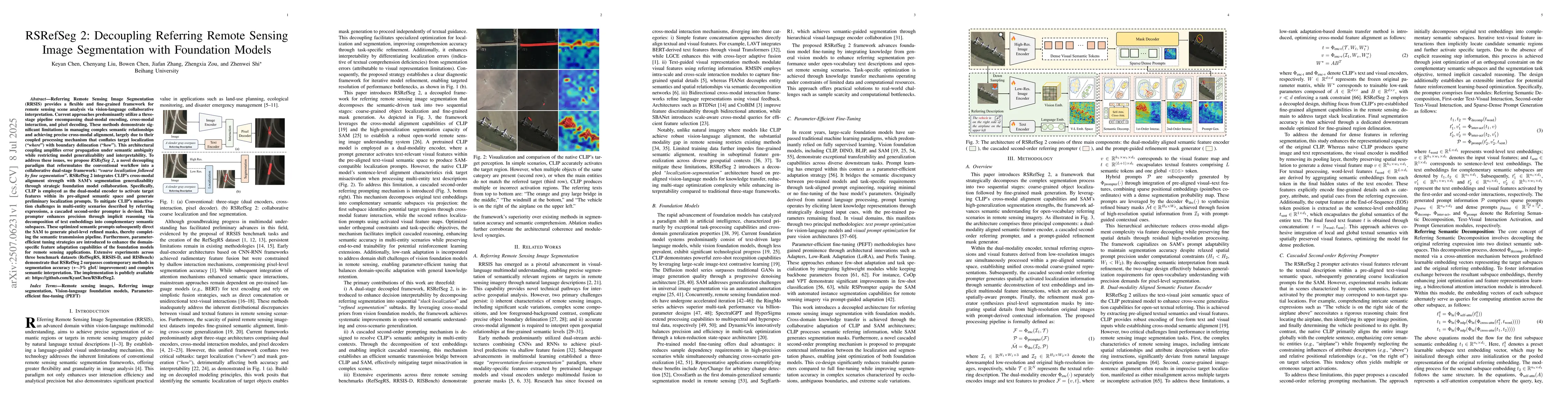 Referring Remote Sensing Image Segmentation provides a flexible and fine-grained framework for remote sensing scene analysis via vision-language collaborative interpretation. Current approaches predominantly utilize a three-stage pipeline encompassing dual-modal encoding, cross-modal interaction, and pixel decoding. These methods demonstrate significant limitations in managing complex semantic relationships and achieving precise cross-modal alignment, largely due to their coupled processing mechanism that conflates target localization with boundary delineation. This architectural coupling amplifies error propagation under semantic ambiguity while restricting model generalizability and interpretability. To address these issues, we propose RSRefSeg 2, a decoupling paradigm that reformulates the conventional workflow into a collaborative dual-stage framework: coarse localization followed by fine segmentation. RSRefSeg 2 integrates CLIP's cross-modal alignment strength with SAM's segmentation generalizability through strategic foundation model collaboration. Specifically, CLIP is employed as the dual-modal encoder to activate target features within its pre-aligned semantic space and generate localization prompts. To mitigate CLIP's misactivation challenges in multi-entity scenarios described by referring texts, a cascaded second-order prompter is devised, which enhances precision through implicit reasoning via decomposition of text embeddings into complementary semantic subspaces. These optimized semantic prompts subsequently direct the SAM to generate pixel-level refined masks, thereby completing the semantic transmission pipeline. Extensive experiments (RefSegRS, RRSIS-D, and RISBench) demonstrate that RSRefSeg 2 surpasses contemporary methods in segmentation accuracy (+~3% gIoU) and complex semantic interpretation. Code is available at: https://github.com/KyanChen/RSRefSeg2.