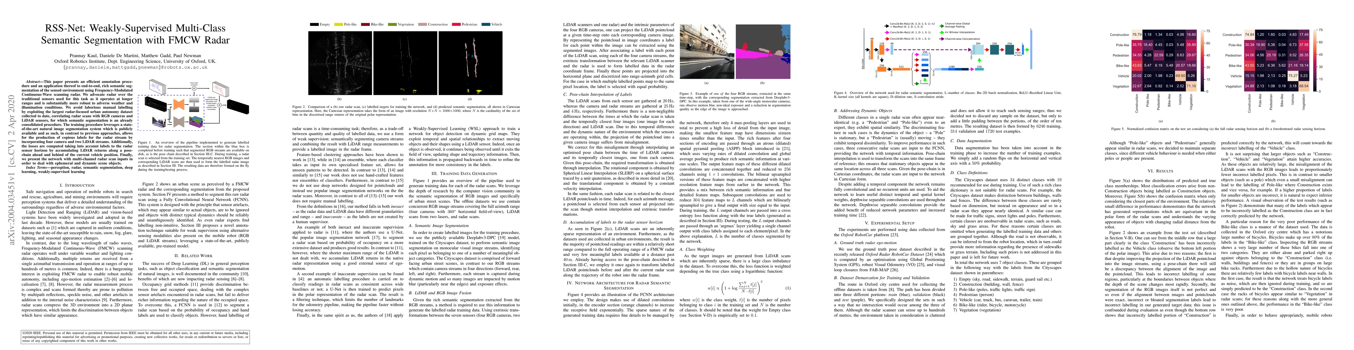 This paper introduces a weakly-supervised method for multi-class semantic segmentation using FMCW radar, leveraging radar's robustness to adverse conditions and correlating it with RGB and LiDAR data to avoid manual labeling. The approach utilizes a multi-channel radar input and incorporates segmentation from other sensors to produce labels for radar data.