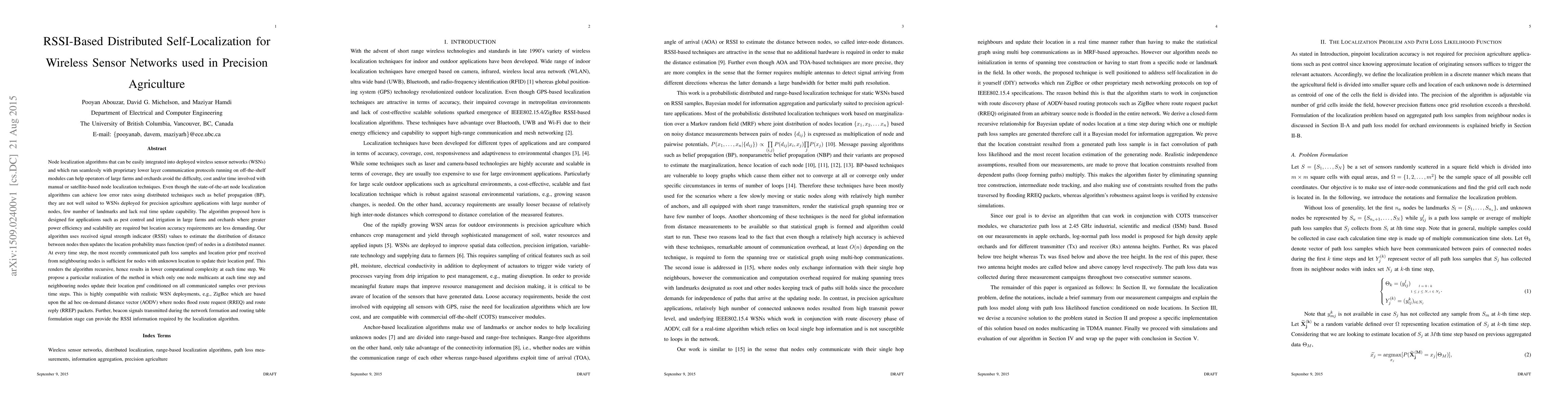 This paper proposes an RSSI-based distributed self-localization algorithm for wireless sensor networks (WSNs) in precision agriculture, aiming for power efficiency and scalability. The algorithm recursively updates nodes' location probability mass functions using received signal strength indicator values, enabling real-time updates with minimal computational complexity.