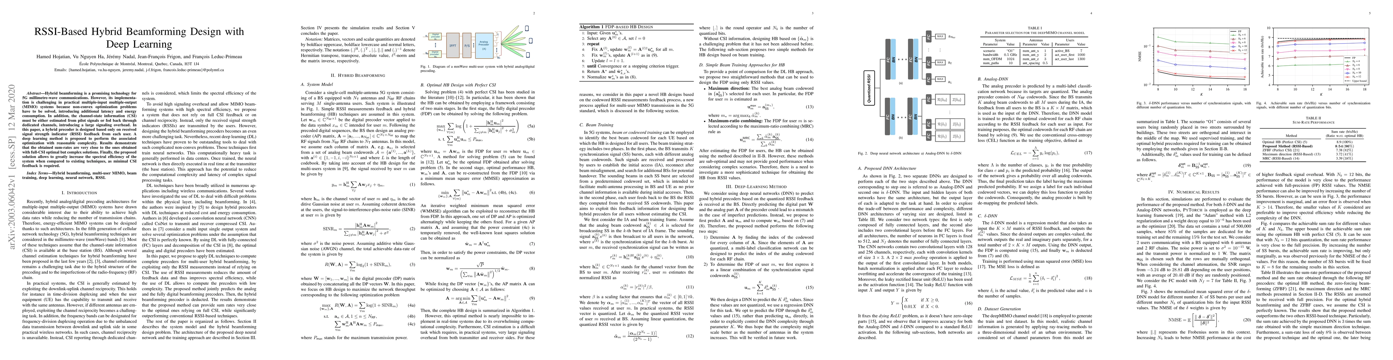 Hybrid beamforming is a promising technology for 5G millimetre-wave communications. However, its implementation is challenging in practical multiple-input multiple-output (MIMO) systems because non-convex optimization problems have to be solved, introducing additional latency and energy consumption. In addition, the channel-state information (CSI) must be either estimated from pilot signals or fed back through dedicated channels, introducing a large signaling overhead. In this paper, a hybrid precoder is designed based only on received signal strength indicator (RSSI) feedback from each user. A deep learning method is proposed to perform the associated optimization with reasonable complexity. Results demonstrate that the obtained sum-rates are very close to the ones obtained with full-CSI optimal but complex solutions. Finally, the proposed solution allows to greatly increase the spectral efficiency of the system when compared to existing techniques, as minimal CSI feedback is required.
