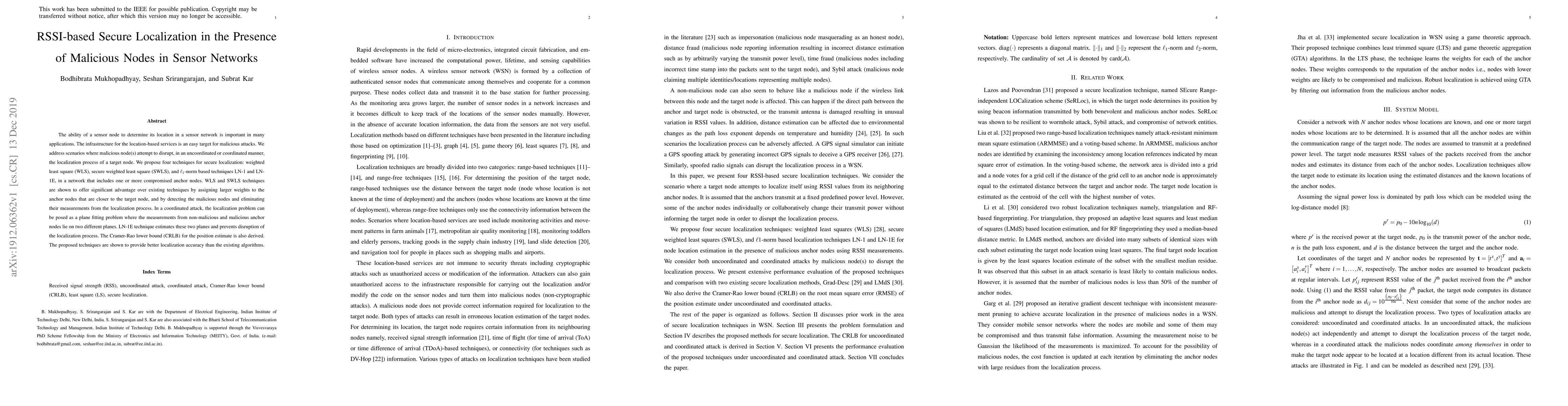 This paper proposes four secure localization techniques—WLS, SWLS, LN-1, and LN-1E—to mitigate attacks by malicious nodes in sensor networks. These methods enhance localization accuracy by weighting closer anchor nodes more heavily and detecting/eliminating malicious measurements, with LN-1E specifically addressing coordinated attacks by estimating separate planes for malicious and non-malicious nodes.