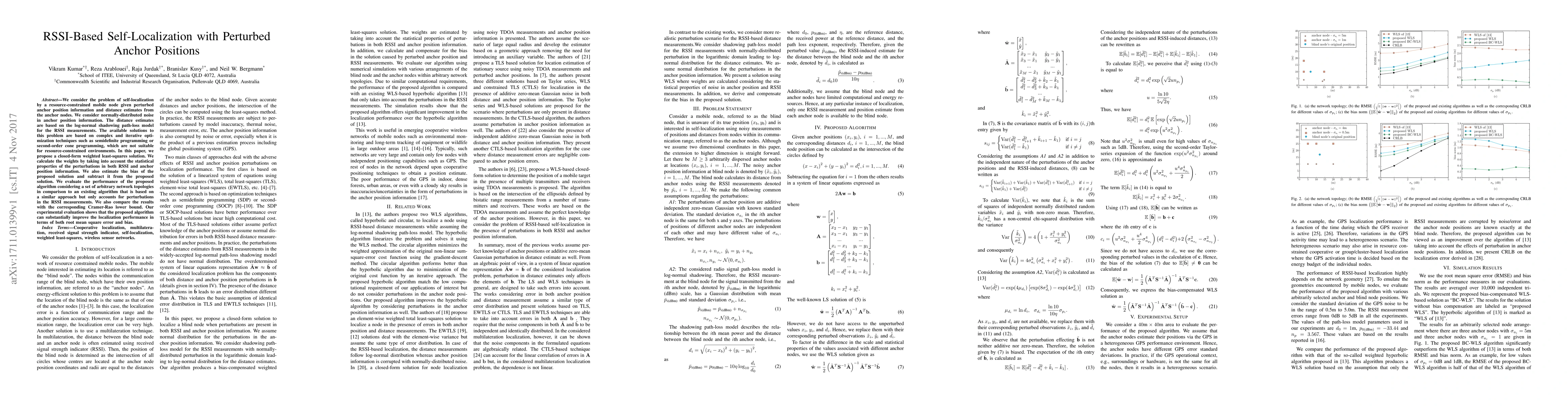 This paper proposes a closed-form weighted least-squares solution for RSSI-based self-localization in resource-constrained environments, addressing the issue of perturbed anchor positions. The algorithm considers statistical properties of RSSI and anchor position noise, and it outperforms existing methods by significantly reducing localization error and bias.