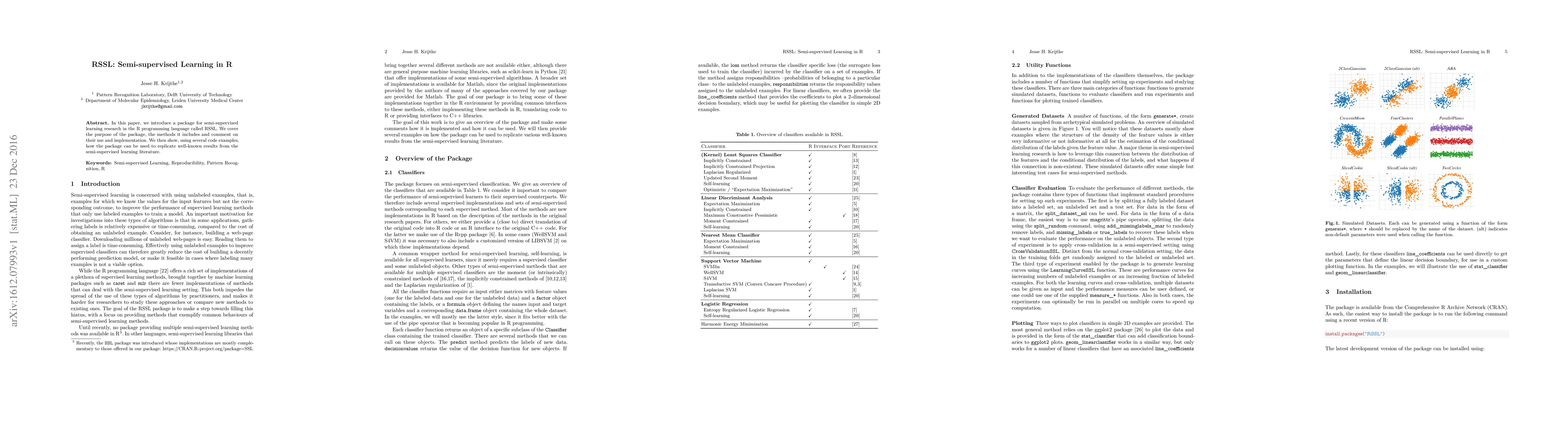A new R package called RSSL is introduced for semi-supervised learning research in the R programming language, providing methods to replicate well-known results from the literature.