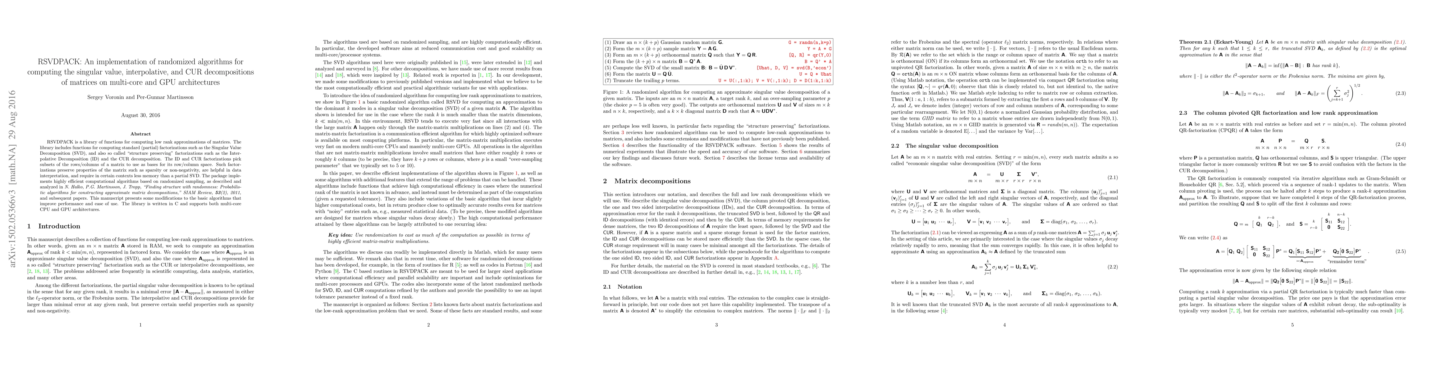 RSVDPACK is a C library for computing low-rank matrix approximations using randomized algorithms on multi-core CPUs and GPUs. It offers efficient implementations of SVD, Interpolative Decomposition, and CUR decompositions, enhancing performance and usability.