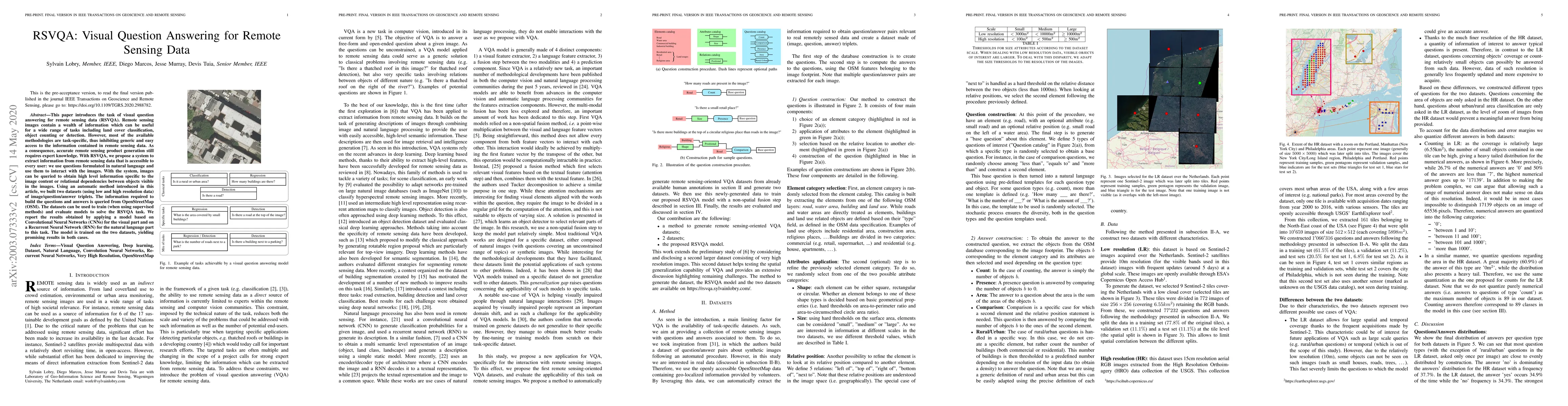 This paper introduces RSVQA, a visual question answering system for remote sensing data, enabling users to query images with natural language questions to extract high-level information. The authors developed two datasets for training and evaluation, achieving promising results using a model combining CNNs and RNNs.