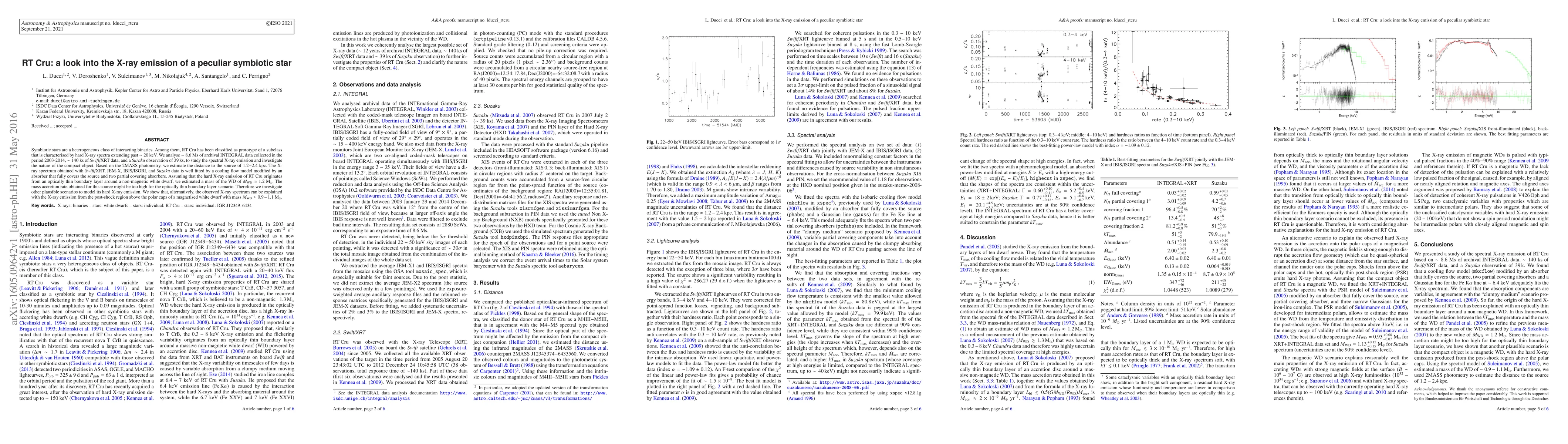 The X-ray emission of RT Cru, a symbiotic star, is studied using archival data from INTEGRAL, Swift/XRT, and Suzaku. The observed spectrum suggests a cooling flow model modified by absorbers, but alternative scenarios propose magnetised white dwarf models with mass around 1 M°Sun.