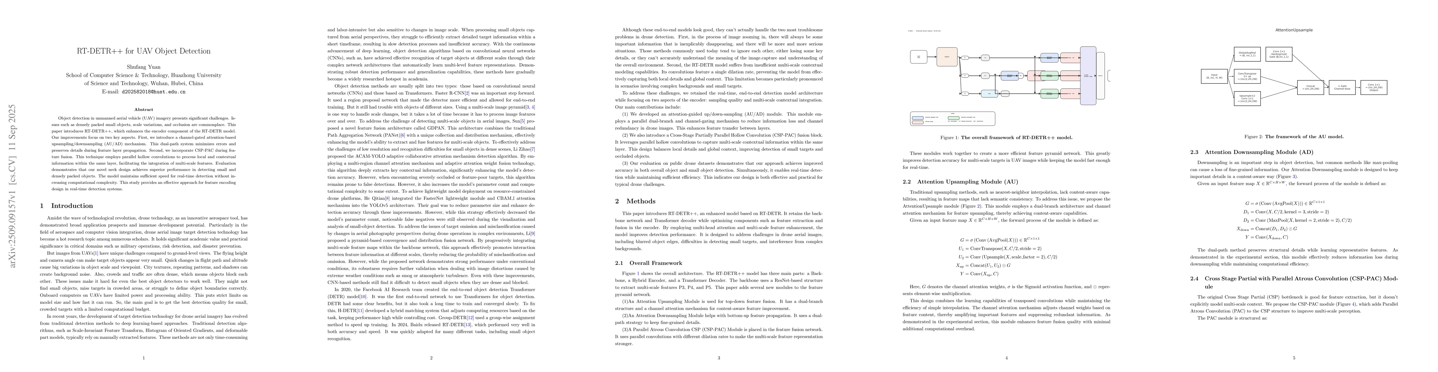 Object detection in unmanned aerial vehicle (UAV) imagery presents significant challenges. Issues such as densely packed small objects, scale variations, and occlusion are commonplace. This paper introduces RT-DETR++, which enhances the encoder component of the RT-DETR model. Our improvements focus on two key aspects. First, we introduce a channel-gated attention-based upsampling/downsampling (AU/AD) mechanism. This dual-path system minimizes errors and preserves details during feature layer propagation. Second, we incorporate CSP-PAC during feature fusion. This technique employs parallel hollow convolutions to process local and contextual information within the same layer, facilitating the integration of multi-scale features. Evaluation demonstrates that our novel neck design achieves superior performance in detecting small and densely packed objects. The model maintains sufficient speed for real-time detection without increasing computational complexity. This study provides an effective approach for feature encoding design in real-time detection systems.