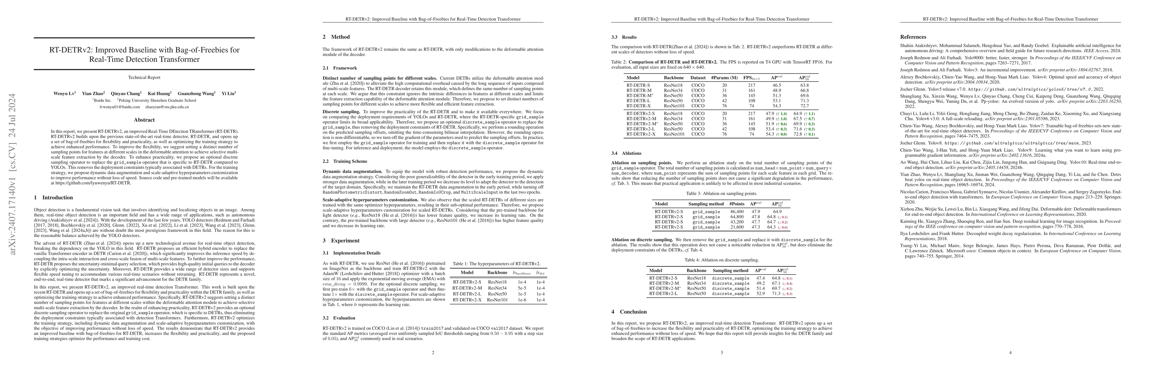 RT-DETRv2 enhances the state-of-the-art real-time detection transformer by introducing practical and flexible modifications, including adaptive sampling points for multi-scale features and a discrete sampling operator, alongside dynamic data augmentation for optimized training. Source code and models available on GitHub.