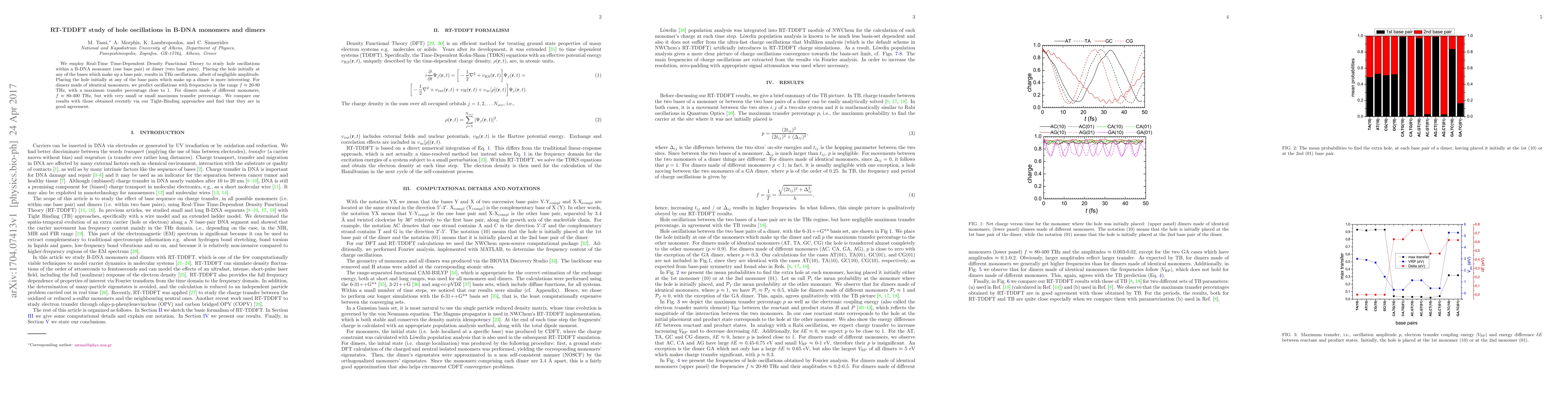 This study uses Real-Time Time-Dependent Density Functional Theory to investigate hole oscillations in B-DNA monomers and dimers, finding THz oscillations with frequencies ranging from 20-80 THz for identical monomer dimers and 80-400 THz for different monomer dimers, with the former showing higher transfer efficiency. Results are consistent with previous Tight-Binding approaches.
