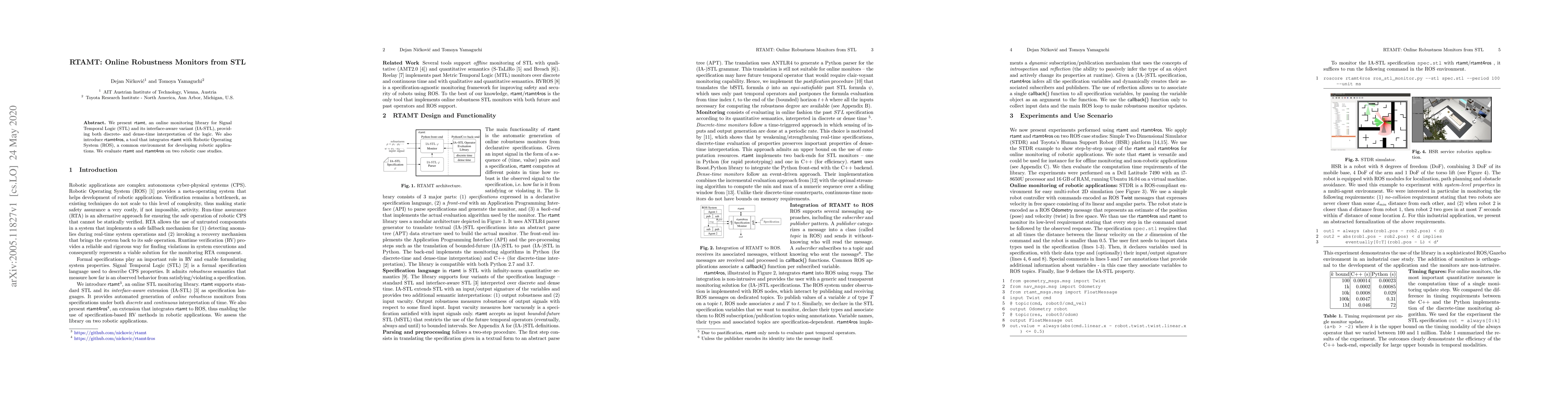 Researchers introduced RTAMT, an online monitoring library for Signal Temporal Logic and its interface-aware variant, which provides robustness monitoring for robotic applications.