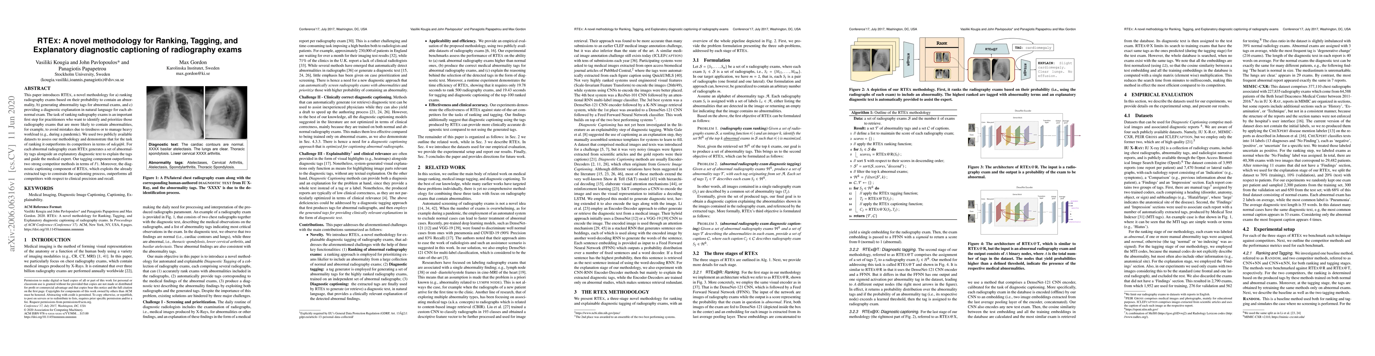 This paper introduces RTEx, a novel methodology for ranking radiography exams by abnormality probability, generating abnormality tags, and providing natural language diagnostic explanations for abnormal exams. RTEx outperforms competitors in ranking accuracy and tagging precision, and its diagnostic captioning component excels in clinical precision and recall.