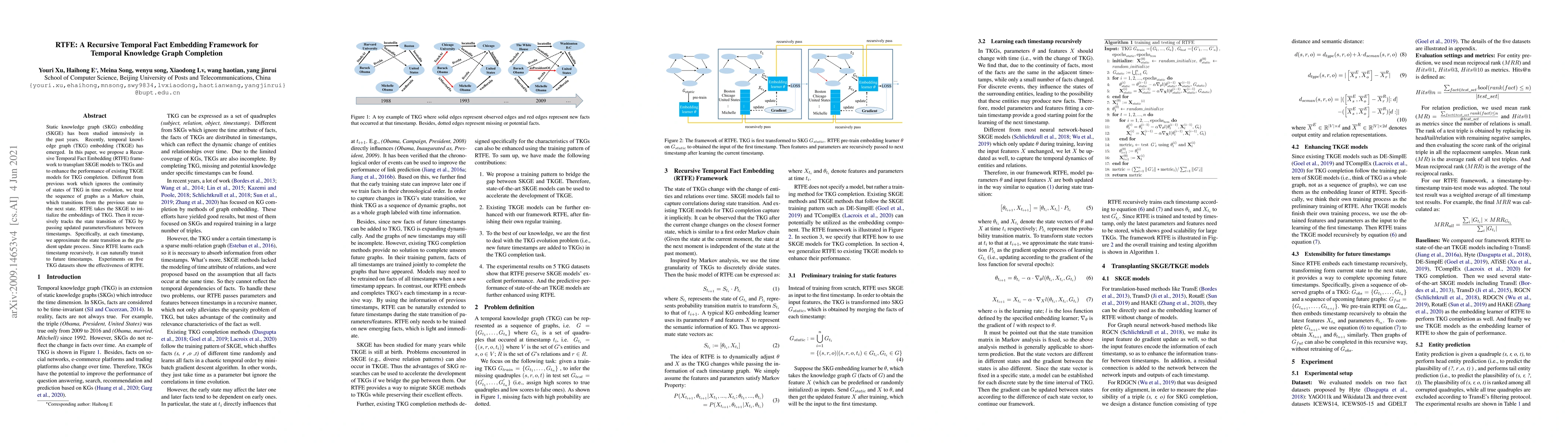The RTFE framework proposes a recursive approach to embed temporal knowledge graphs by treating their evolution as a Markov chain, leveraging static knowledge graph embedding to initialize and recursively update embeddings over time, demonstrating improved performance in temporal knowledge graph completion. Experiments on multiple datasets validate the effectiveness of this method.