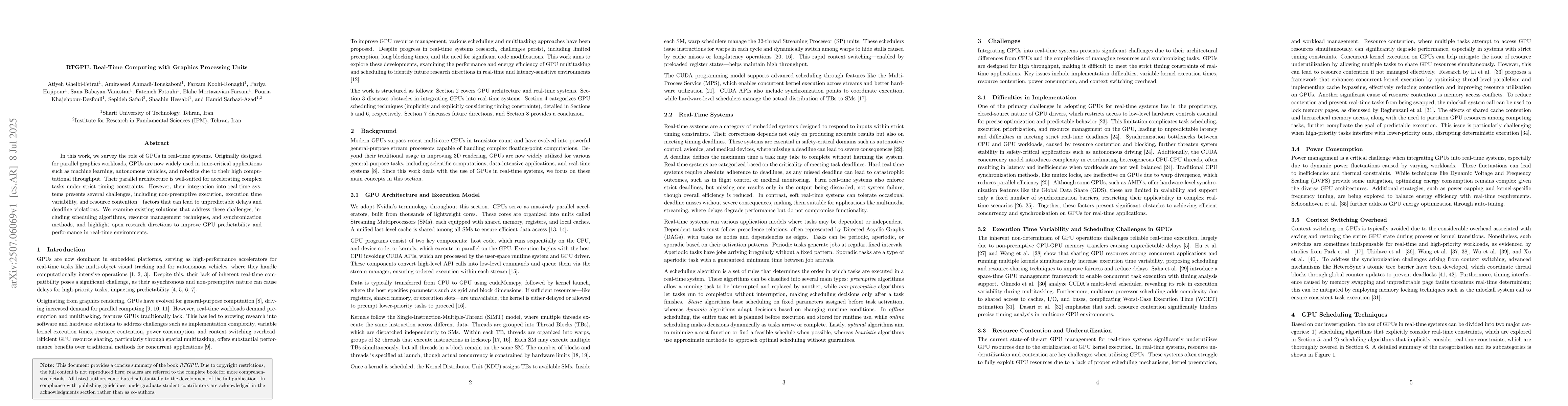 In this work, we survey the role of GPUs in real-time systems. Originally designed for parallel graphics workloads, GPUs are now widely used in time-critical applications such as machine learning, autonomous vehicles, and robotics due to their high computational throughput. Their parallel architecture is well-suited for accelerating complex tasks under strict timing constraints. However, their integration into real-time systems presents several challenges, including non-preemptive execution, execution time variability, and resource contention; factors that can lead to unpredictable delays and deadline violations. We examine existing solutions that address these challenges, including scheduling algorithms, resource management techniques, and synchronization methods, and highlight open research directions to improve GPU predictability and performance in real-time environments.