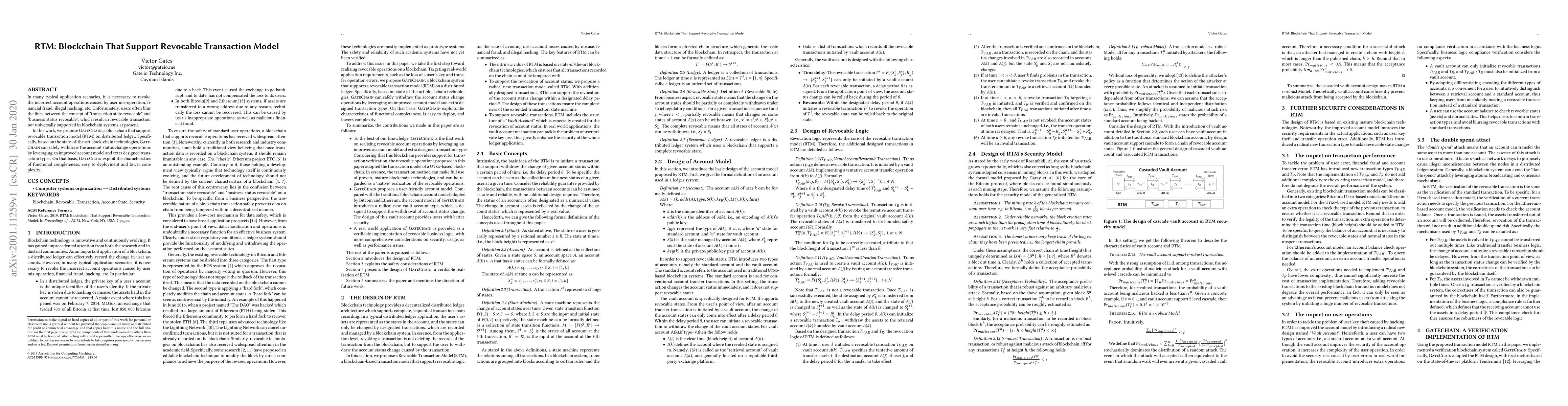 In many typical application scenarios, it is necessary to revoke the incorrect account operations caused by user mis-operation, financial fraud, illegal hacking, etc. Unfortunately, users often blur the lines between the concept of "transaction state revocable" and "business status revocable", which result in revocable transaction not universally supported in blockchain systems at present. In this work, we propose GateChain , a blockchain that support revocable transaction model (RTM) on distributed ledger. Specifically, based on the state-of-the-art blockchain technologies, GateChain can safely withdraw the account status change operations by leveraging an improved account model and extra designed transaction types. On that basis, GateChain exploit the characteristics of functional completeness, easy to deployment and lower complexity.