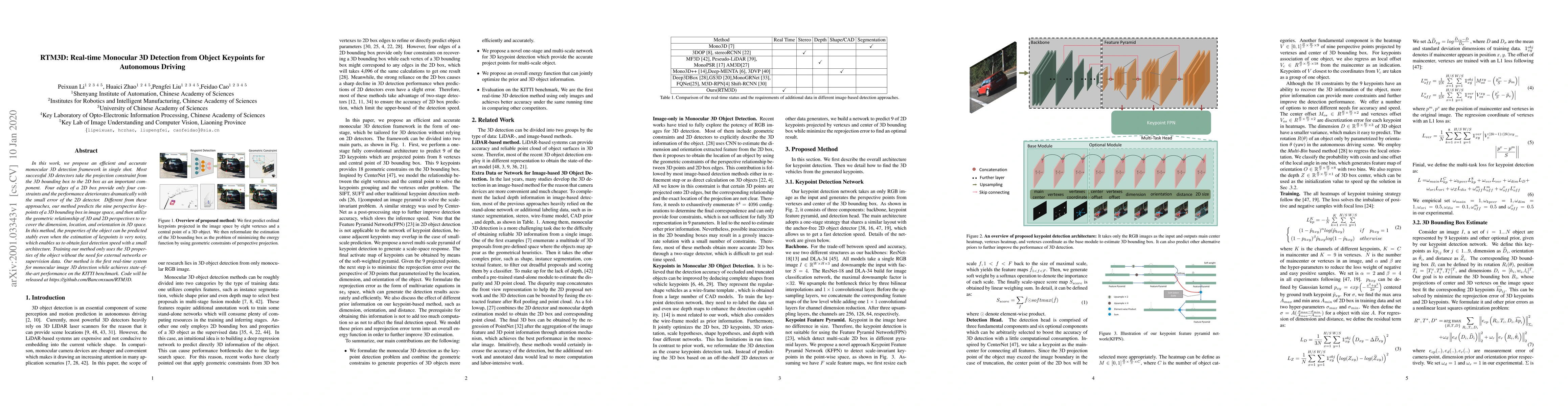 This paper presents RTM3D, a real-time monocular 3D detection framework that predicts nine keypoints of a 3D bounding box, improving stability and accuracy over traditional 2D box projections. The method achieves state-of-the-art performance on the KITTI benchmark while maintaining real-time speed.