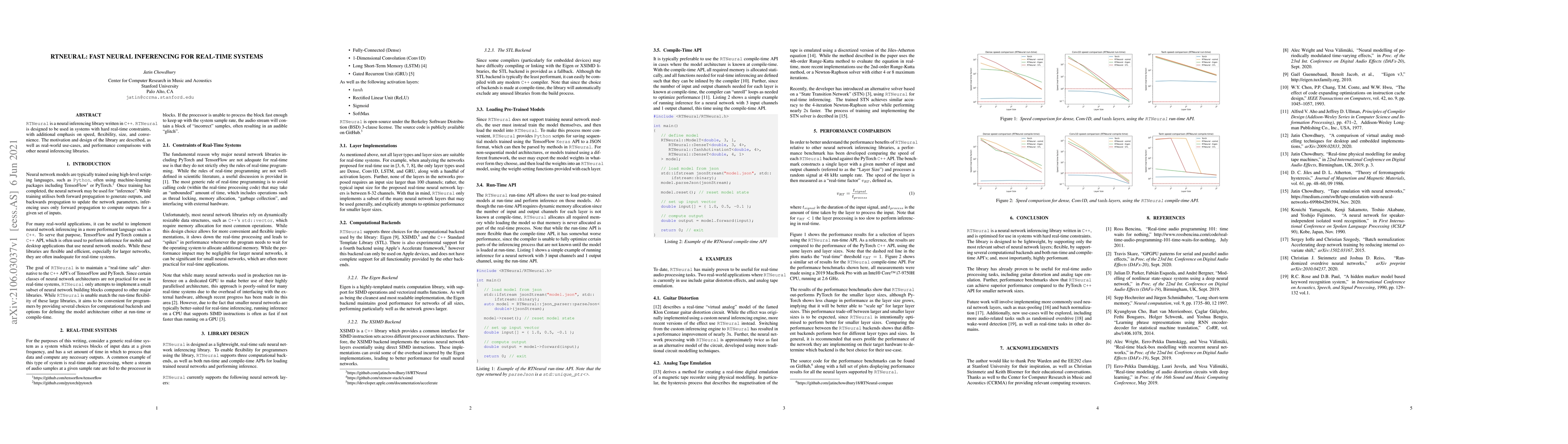 RTNeural is a C++ library for fast neural inferencing tailored for real-time systems, emphasizing speed, flexibility, and minimal size. It is compared against other libraries to demonstrate its performance benefits.