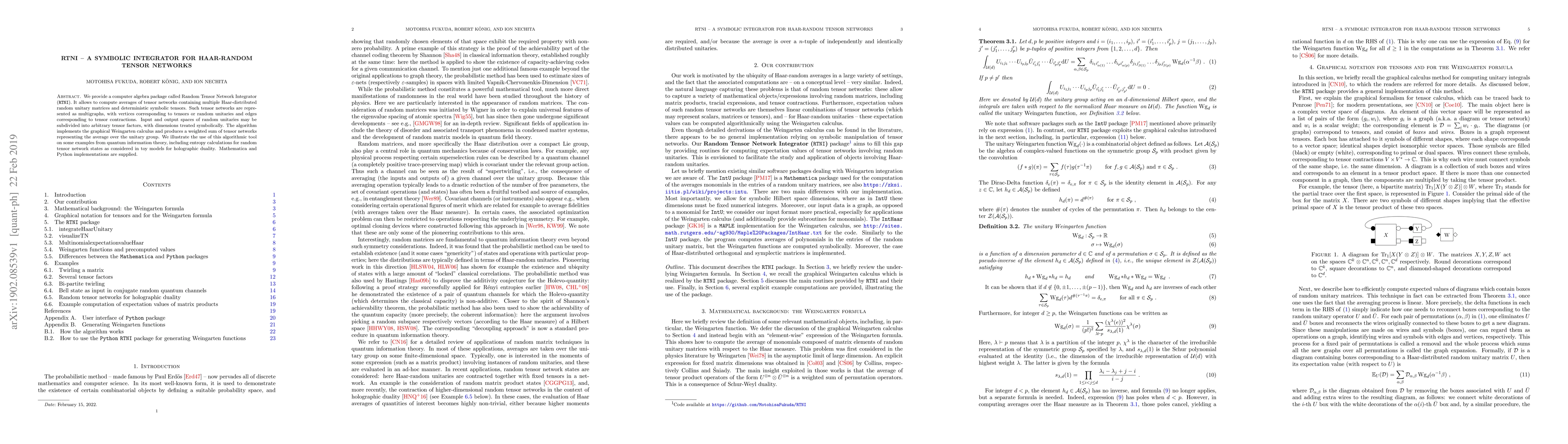 The paper introduces RTNI, a computer algebra package for computing averages in tensor networks with random unitary matrices and symbolic tensors, utilizing the graphical Weingarten calculus. It demonstrates applications in quantum information theory, including entropy calculations for random tensor network states.