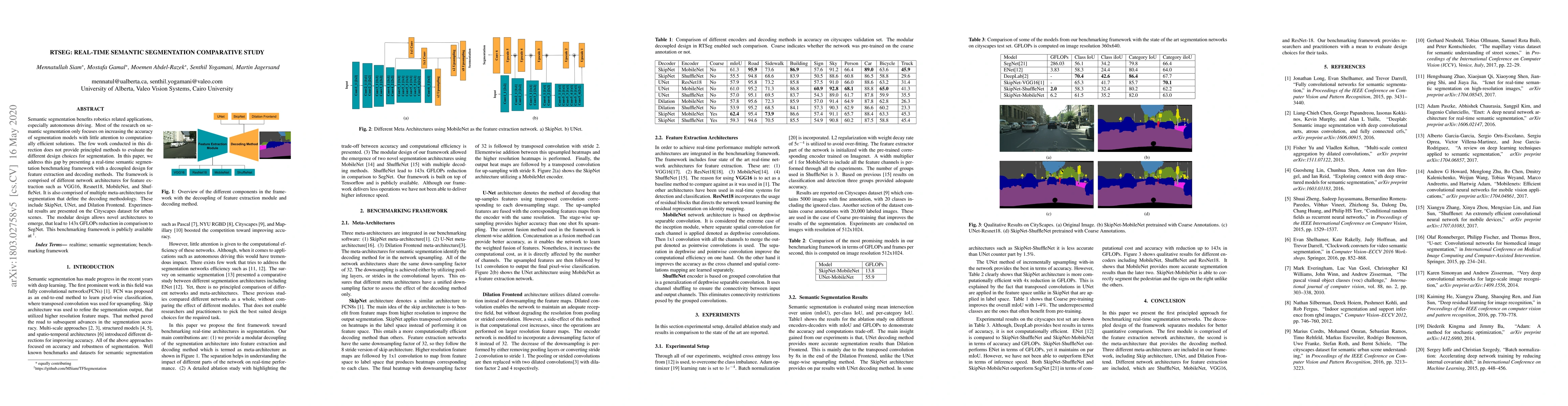 Semantic segmentation benefits robotics related applications especially autonomous driving. Most of the research on semantic segmentation is only on increasing the accuracy of segmentation models with little attention to computationally efficient solutions. The few work conducted in this direction does not provide principled methods to evaluate the different design choices for segmentation. In this paper, we address this gap by presenting a real-time semantic segmentation benchmarking framework with a decoupled design for feature extraction and decoding methods. The framework is comprised of different network architectures for feature extraction such as VGG16, Resnet18, MobileNet, and ShuffleNet. It is also comprised of multiple meta-architectures for segmentation that define the decoding methodology. These include SkipNet, UNet, and Dilation Frontend. Experimental results are presented on the Cityscapes dataset for urban scenes. The modular design allows novel architectures to emerge, that lead to 143x GFLOPs reduction in comparison to SegNet. This benchmarking framework is publicly available at "https://github.com/MSiam/TFSegmentation".