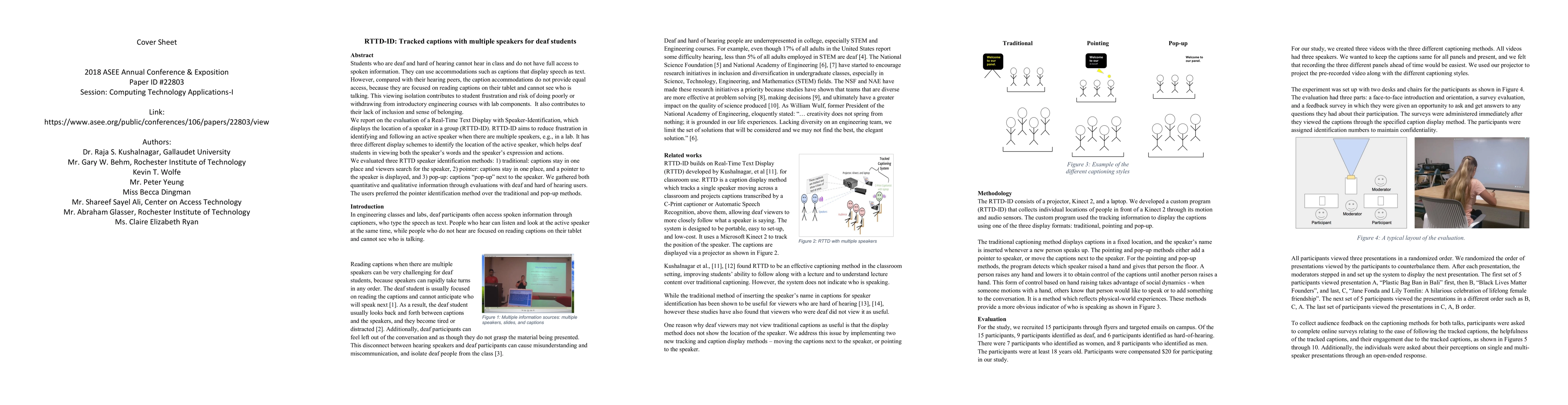 This study evaluates a Real-Time Text Display with Speaker-Identification (RTTD-ID) to improve caption accessibility for deaf students in classrooms with multiple speakers. Users preferred the pointer method, which highlights the speaker, over traditional and pop-up methods, indicating it better supports engagement and inclusion in lectures.