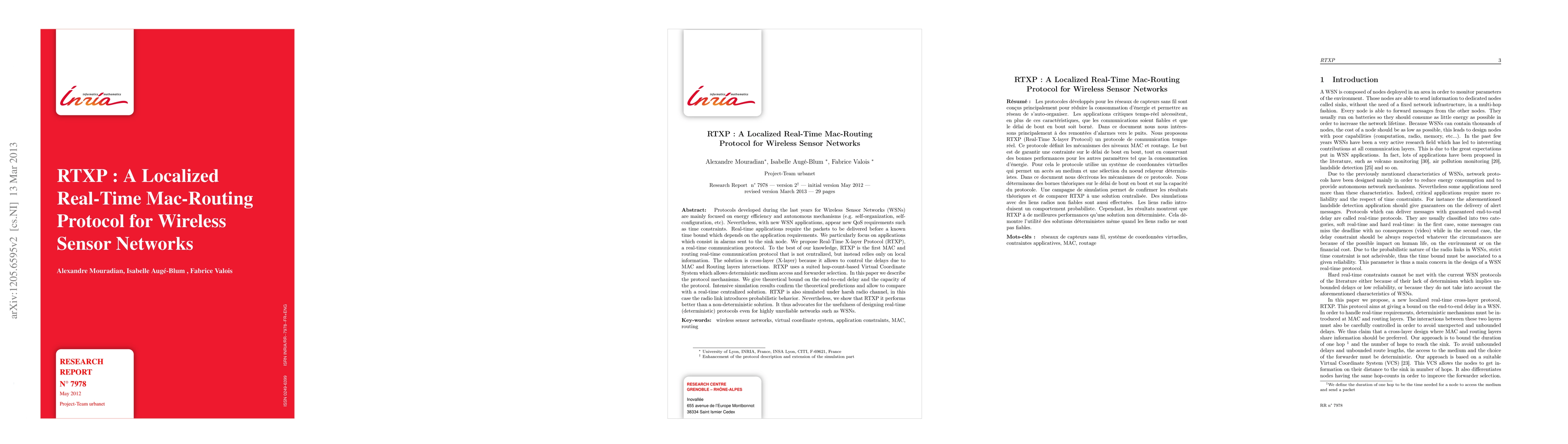 The RTXP protocol is a localized, real-time communication protocol for Wireless Sensor Networks that integrates MAC and routing layers to meet time constraints for real-time applications. It demonstrates better performance than non-deterministic solutions even under harsh radio conditions, advocating for deterministic protocols in unreliable networks.