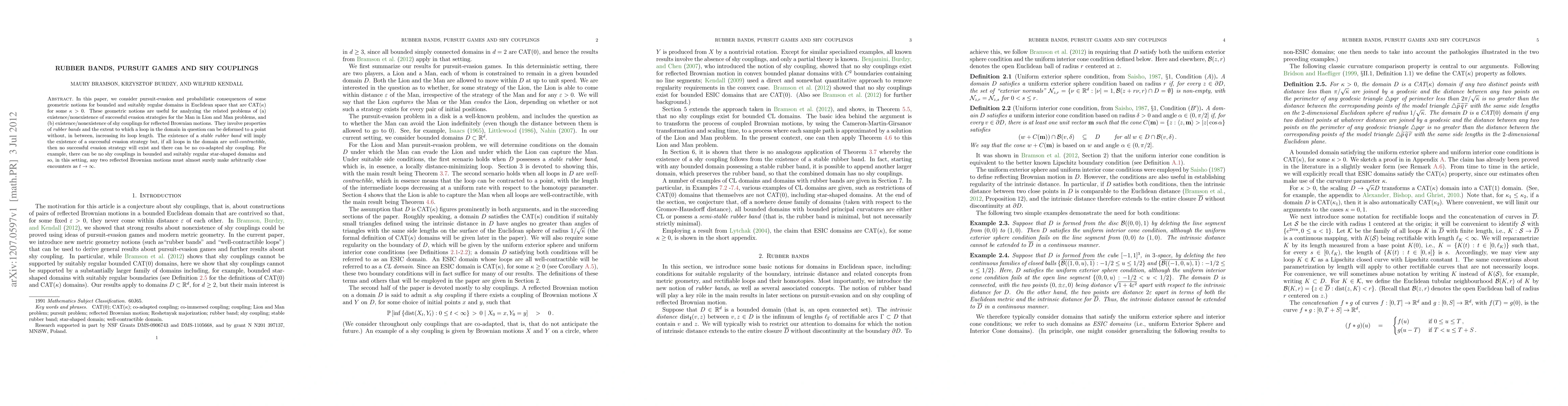 In this paper, we consider pursuit-evasion and probabilistic consequences of some geometric notions for bounded and suitably regular domains in Euclidean space that are CAT(kappa) for some kappa > 0. These geometric notions are useful for analyzing the related problems of (a) existence/nonexistence of successful evasion strategies for the Man in Lion and Man problems, and (b) existence/nonexistence of shy couplings for reflected Brownian motions. They involve properties of rubber bands and the extent to which a loop in the domain in question can be deformed to a point without, in between, increasing its loop length. The existence of a stable rubber band will imply the existence of a successful evasion strategy but, if all loops in the domain are well-contractible, then no successful evasion strategy will exist and there can be no co-adapted shy coupling. For example, there can be no shy couplings in bounded and suitably regular star-shaped domains and so, in this setting, any two reflected Brownian motions must almost surely make arbitrarily close encounters as t tends to infinity.