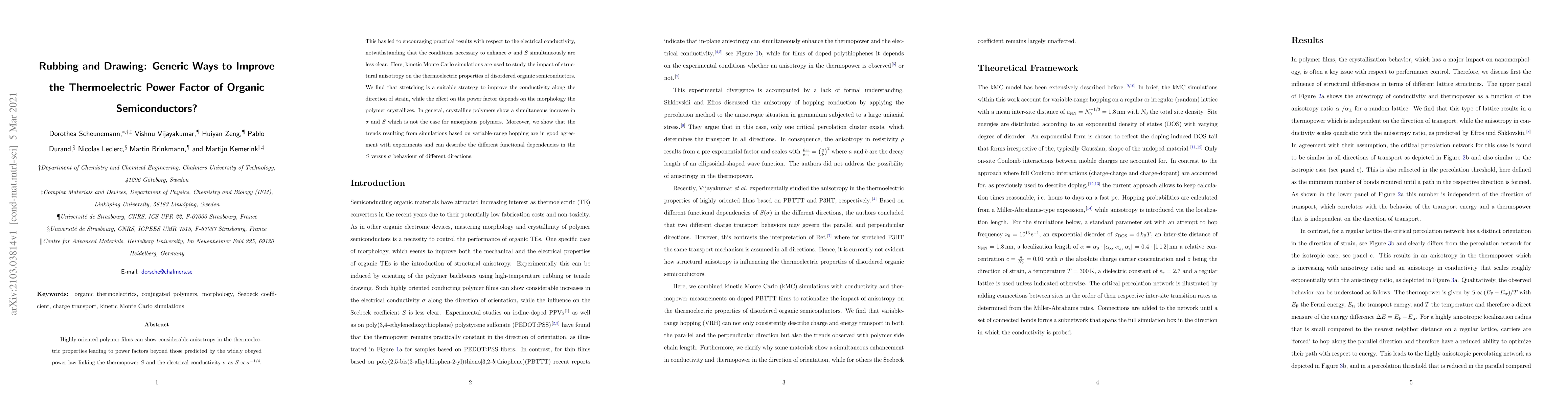 Highly oriented polymer films can show considerable anisotropy in the thermoelectric properties leading to power factors beyond those predicted by the widely obeyed power law linking the thermopower $S$ and the electrical conductivity $\sigma$ as $S\propto\sigma^{-1/4}$. This has led to encouraging practical results with respect to the electrical conductivity, notwithstanding that the conditions necessary to enhance $\sigma$ and $S$ simultaneously are less clear. Here, kinetic Monte Carlo simulations are used to study the impact of structural anisotropy on the thermoelectric properties of disordered organic semiconductors. We find that stretching is a suitable strategy to improve the conductivity along the direction of strain, while the effect on the power factor depends on the morphology the polymer crystallizes. In general, crystalline polymers show a simultaneous increase in $\sigma$ and $S$ which is not the case for amorphous polymers. Moreover, we show that the trends resulting from simulations based on variable-range hopping are in good agreement with experiments and can describe the different functional dependencies in the $S$ versus $\sigma$ behaviour of different directions.